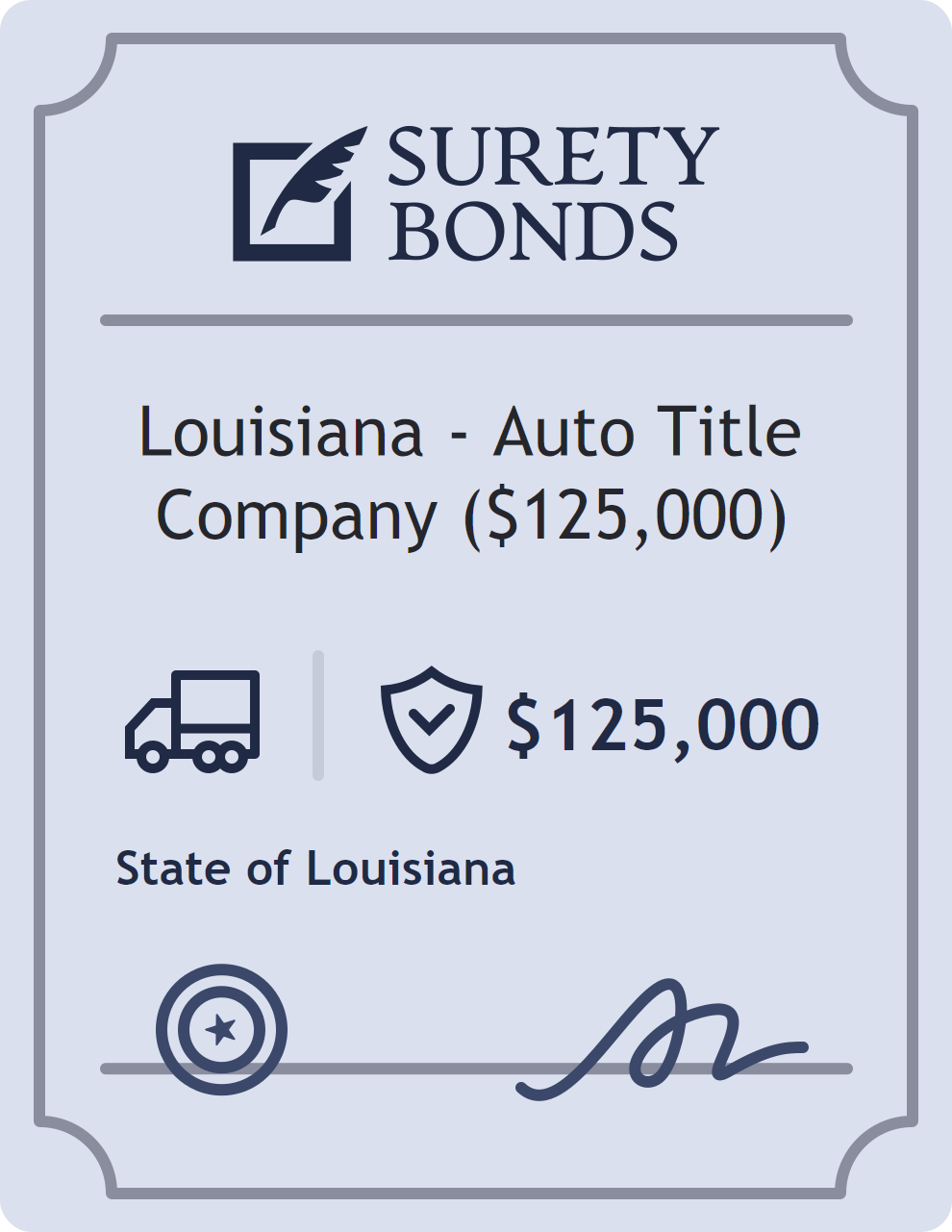 The Louisiana – Auto Title Company ($125,000) is a $125,000 surety bond required in Louisiana. It provides a financial guarantee that the bonded party will satisfy all statutory and contractual obligations related to this bond type. The surety reviews financial strength, compliance history, and indemnity support before approving the obligation. Maintaining uninterrupted coverage for the entire 1 Year term is essential; lapses can trigger penalties, contract defaults, or license suspension in Louisiana. Underwriters typically request financial statements, references, and proof of licensing before quoting terms so they can evaluate repayment capacity. Throughout the bond term, the principal must maintain accurate books, respond to regulator inquiries, and remediate any complaints to prevent a claim. Many authorities in Louisiana also require renewal certificates 30 to 60 days in advance, and failure to provide proof can halt permitting or bid submissions. The $125,000 limit demonstrates to customers, partners, and oversight agencies that the bonded party maintains a reliable, surety-backed source of funds dedicated to ongoing compliance. The obligee for this bond is State of Louisiana.