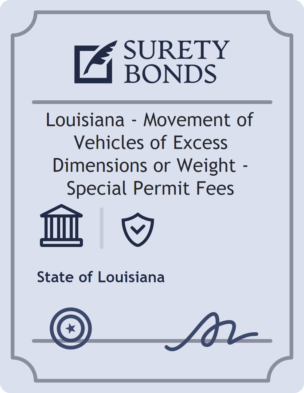 The Louisiana – Movement of Vehicles of Excess Dimensions or Weight – Special Permit Fees is classified as a Government/Public Official Bonds with a $10,000 obligation in Louisiana. Government/Public Official Bonds are surety bonds that ensure elected and appointed officials perform their duties faithfully and in accordance with the law. These bonds provide financial protection in cases of misconduct, negligence, or misuse of authority by public officials. The surety reviews financial strength, compliance history, and indemnity support before approving the obligation. Maintaining uninterrupted coverage for the entire 1 Year term is essential; lapses can trigger penalties, contract defaults, or license suspension in Louisiana. Underwriters typically request financial statements, references, and proof of licensing before quoting terms so they can evaluate repayment capacity. Throughout the bond term, the principal must maintain accurate books, respond to regulator inquiries, and remediate any complaints to prevent a claim. Many authorities in Louisiana also require renewal certificates 30 to 60 days in advance, and failure to provide proof can halt permitting or bid submissions. The $10,000 limit demonstrates to customers, partners, and oversight agencies that the bonded party maintains a reliable, surety-backed source of funds dedicated to ongoing compliance. The obligee for this bond is State of Louisiana.