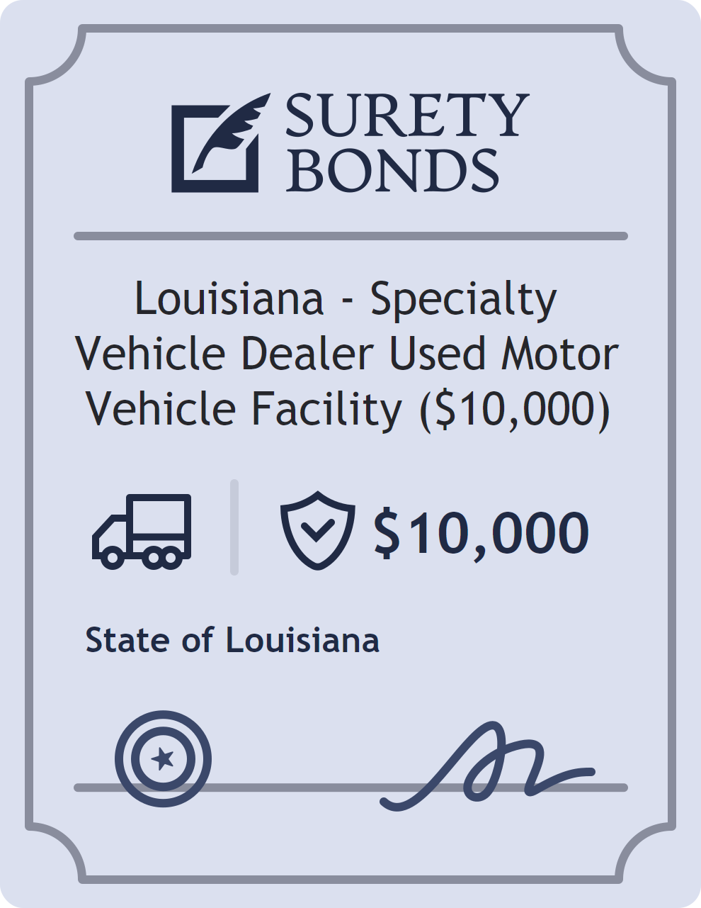 The Louisiana – Specialty Vehicle Dealer Used Motor Vehicle Facility ($10,000) is a $10,000 surety bond required in Louisiana. It provides a financial guarantee that the bonded party will satisfy all statutory and contractual obligations related to this bond type. The surety reviews financial strength, compliance history, and indemnity support before approving the obligation. Maintaining uninterrupted coverage for the entire 1 Year term is essential; lapses can trigger penalties, contract defaults, or license suspension in Louisiana. Underwriters typically request financial statements, references, and proof of licensing before quoting terms so they can evaluate repayment capacity. Throughout the bond term, the principal must maintain accurate books, respond to regulator inquiries, and remediate any complaints to prevent a claim. Many authorities in Louisiana also require renewal certificates 30 to 60 days in advance, and failure to provide proof can halt permitting or bid submissions. The $10,000 limit demonstrates to customers, partners, and oversight agencies that the bonded party maintains a reliable, surety-backed source of funds dedicated to ongoing compliance. The obligee for this bond is State of Louisiana.