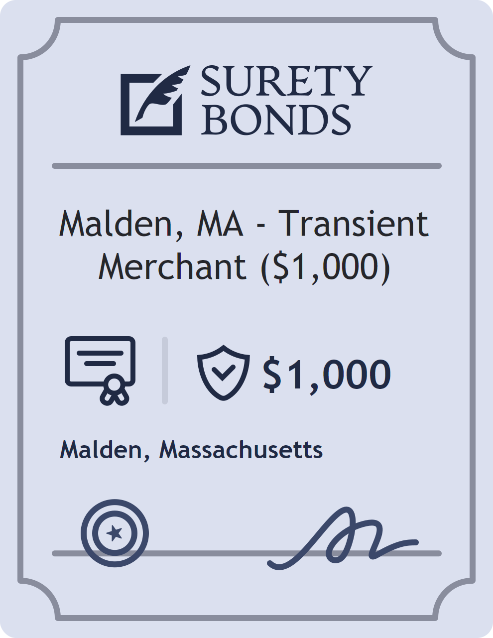 The Malden, MA – Transient Merchant ($1,000) is classified as a Professional License Bonds with a $1,000 obligation in Massachusetts. Professional License Bonds are surety bonds required for licensed professionals across various industries. They guarantee compliance with licensing laws and ethical standards, protecting clients and regulatory bodies from harm. The surety reviews financial strength, compliance history, and indemnity support before approving the obligation. Maintaining uninterrupted coverage for the entire 1 Year term is essential; lapses can trigger penalties, contract defaults, or license suspension in Massachusetts. Underwriters typically request financial statements, references, and proof of licensing before quoting terms so they can evaluate repayment capacity. Throughout the bond term, the principal must maintain accurate books, respond to regulator inquiries, and remediate any complaints to prevent a claim. Many authorities in Massachusetts also require renewal certificates 30 to 60 days in advance, and failure to provide proof can halt permitting or bid submissions. The $1,000 limit demonstrates to customers, partners, and oversight agencies that the bonded party maintains a reliable, surety-backed source of funds dedicated to ongoing compliance. The obligee for this bond is Malden.