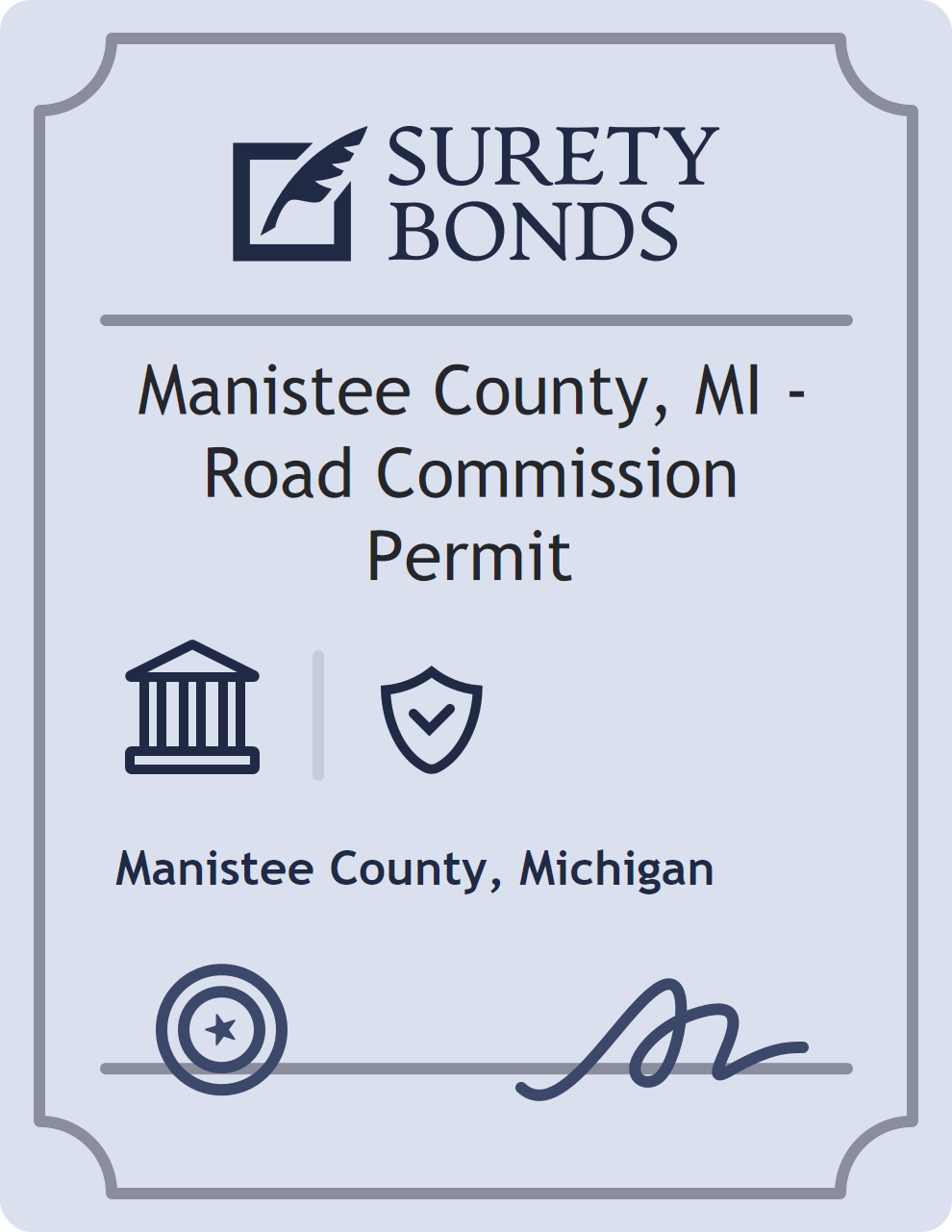 The Manistee County, MI – Road Commission Permit is classified as a Government/Public Official Bonds with a $10,000 obligation in Michigan. Government/Public Official Bonds are surety bonds that ensure elected and appointed officials perform their duties faithfully and in accordance with the law. These bonds provide financial protection in cases of misconduct, negligence, or misuse of authority by public officials. The surety reviews financial strength, compliance history, and indemnity support before approving the obligation. Maintaining uninterrupted coverage for the entire 1 Year term is essential; lapses can trigger penalties, contract defaults, or license suspension in Michigan. Underwriters typically request financial statements, references, and proof of licensing before quoting terms so they can evaluate repayment capacity. Throughout the bond term, the principal must maintain accurate books, respond to regulator inquiries, and remediate any complaints to prevent a claim. Many authorities in Michigan also require renewal certificates 30 to 60 days in advance, and failure to provide proof can halt permitting or bid submissions. The $10,000 limit demonstrates to customers, partners, and oversight agencies that the bonded party maintains a reliable, surety-backed source of funds dedicated to ongoing compliance. The obligee for this bond is Manistee County.