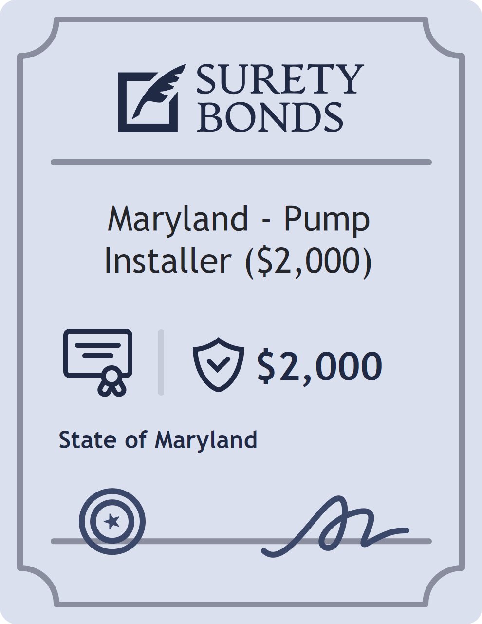 The Maryland – Pump Installer ($2,000) is classified as a Professional License Bonds with a $2,000 obligation in Maryland. Professional License Bonds are surety bonds required for licensed professionals across various industries. They guarantee compliance with licensing laws and ethical standards, protecting clients and regulatory bodies from harm. The surety reviews financial strength, compliance history, and indemnity support before approving the obligation. Maintaining uninterrupted coverage for the entire 1 Year term is essential; lapses can trigger penalties, contract defaults, or license suspension in Maryland. Underwriters typically request financial statements, references, and proof of licensing before quoting terms so they can evaluate repayment capacity. Throughout the bond term, the principal must maintain accurate books, respond to regulator inquiries, and remediate any complaints to prevent a claim. Many authorities in Maryland also require renewal certificates 30 to 60 days in advance, and failure to provide proof can halt permitting or bid submissions. The $2,000 limit demonstrates to customers, partners, and oversight agencies that the bonded party maintains a reliable, surety-backed source of funds dedicated to ongoing compliance. The obligee for this bond is State of Maryland.