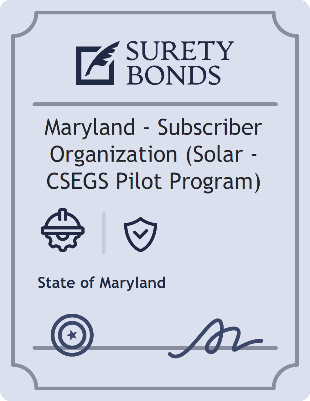 The Maryland – Subscriber Organization (Solar – CSEGS Pilot Program) is classified as a Contractor Bonds with a $10,000 obligation in Maryland. Contractor Bonds are surety bonds required for individuals or businesses performing construction work. They guarantee that contractors will comply with building codes, licensing requirements, and contractual obligations. The bond provides financial protection to property owners and the public in cases of poor workmanship, regulatory violations, or unfinished work. The surety reviews financial strength, compliance history, and indemnity support before approving the obligation. Maintaining uninterrupted coverage for the entire 1 Year term is essential; lapses can trigger penalties, contract defaults, or license suspension in Maryland. Underwriters typically request financial statements, references, and proof of licensing before quoting terms so they can evaluate repayment capacity. Throughout the bond term, the principal must maintain accurate books, respond to regulator inquiries, and remediate any complaints to prevent a claim. Many authorities in Maryland also require renewal certificates 30 to 60 days in advance, and failure to provide proof can halt permitting or bid submissions. The $10,000 limit demonstrates to customers, partners, and oversight agencies that the bonded party maintains a reliable, surety-backed source of funds dedicated to ongoing compliance. The obligee for this bond is State of Maryland.