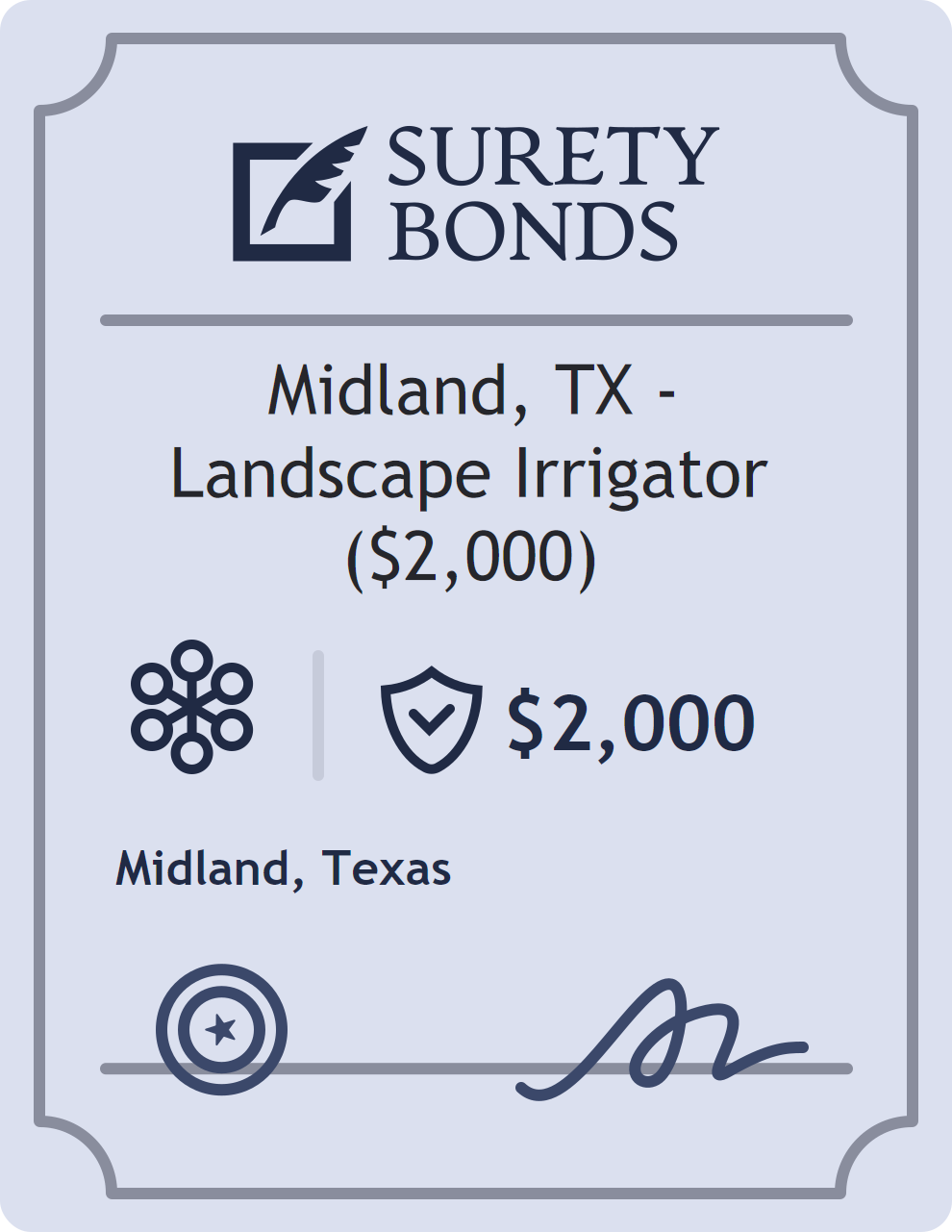 The Midland, TX – Landscape Irrigator ($2,000) is classified as a Miscellaneous Bonds with a $2,000 obligation in Texas. Miscellaneous Bonds cover a wide range of non-standard surety bond requirements. They act as financial protection in cases where state or federal regulations require assurance of compliance and ethical conduct. The surety reviews financial strength, compliance history, and indemnity support before approving the obligation. Maintaining uninterrupted coverage for the entire 1 Year term is essential; lapses can trigger penalties, contract defaults, or license suspension in Texas. Underwriters typically request financial statements, references, and proof of licensing before quoting terms so they can evaluate repayment capacity. Throughout the bond term, the principal must maintain accurate books, respond to regulator inquiries, and remediate any complaints to prevent a claim. Many authorities in Texas also require renewal certificates 30 to 60 days in advance, and failure to provide proof can halt permitting or bid submissions. The $2,000 limit demonstrates to customers, partners, and oversight agencies that the bonded party maintains a reliable, surety-backed source of funds dedicated to ongoing compliance. The obligee for this bond is Midland.