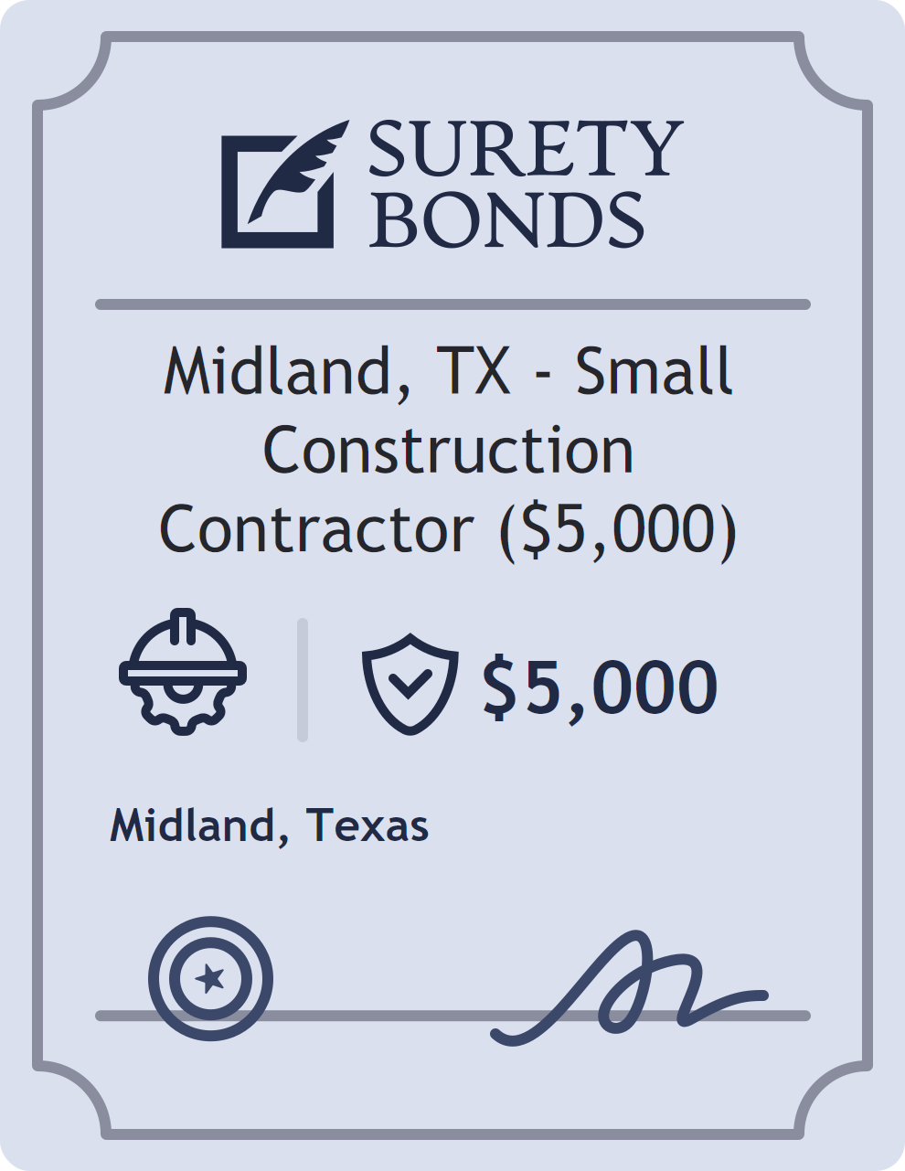 The Midland, TX – Small Construction Contractor ($5,000) is classified as a Contractor Bonds with a $5,000 obligation in Texas. Contractor Bonds are surety bonds required for individuals or businesses performing construction work. They guarantee that contractors will comply with building codes, licensing requirements, and contractual obligations. The bond provides financial protection to property owners and the public in cases of poor workmanship, regulatory violations, or unfinished work. The surety reviews financial strength, compliance history, and indemnity support before approving the obligation. Maintaining uninterrupted coverage for the entire 1 Year term is essential; lapses can trigger penalties, contract defaults, or license suspension in Texas. Underwriters typically request financial statements, references, and proof of licensing before quoting terms so they can evaluate repayment capacity. Throughout the bond term, the principal must maintain accurate books, respond to regulator inquiries, and remediate any complaints to prevent a claim. Many authorities in Texas also require renewal certificates 30 to 60 days in advance, and failure to provide proof can halt permitting or bid submissions. The $5,000 limit demonstrates to customers, partners, and oversight agencies that the bonded party maintains a reliable, surety-backed source of funds dedicated to ongoing compliance. The obligee for this bond is Midland.