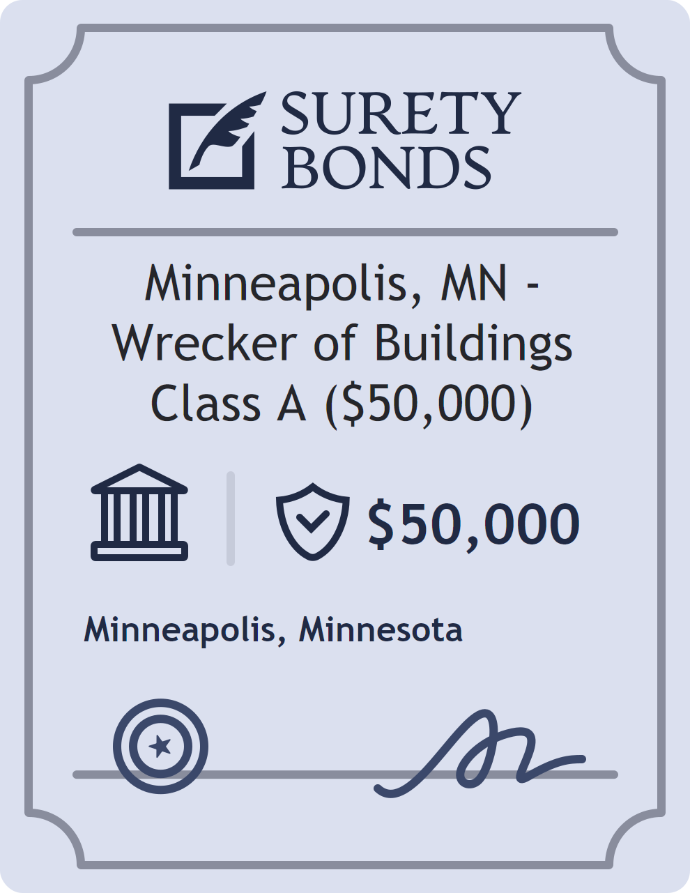 The Minneapolis, MN – Wrecker of Buildings Class A ($50,000) is classified as a Government/Public Official Bonds with a $50,000 obligation in Minnesota. Government/Public Official Bonds are surety bonds that ensure elected and appointed officials perform their duties faithfully and in accordance with the law. These bonds provide financial protection in cases of misconduct, negligence, or misuse of authority by public officials. The surety reviews financial strength, compliance history, and indemnity support before approving the obligation. Maintaining uninterrupted coverage for the entire 1 Year term is essential; lapses can trigger penalties, contract defaults, or license suspension in Minnesota. Underwriters typically request financial statements, references, and proof of licensing before quoting terms so they can evaluate repayment capacity. Throughout the bond term, the principal must maintain accurate books, respond to regulator inquiries, and remediate any complaints to prevent a claim. Many authorities in Minnesota also require renewal certificates 30 to 60 days in advance, and failure to provide proof can halt permitting or bid submissions. The $50,000 limit demonstrates to customers, partners, and oversight agencies that the bonded party maintains a reliable, surety-backed source of funds dedicated to ongoing compliance. The obligee for this bond is Minneapolis.