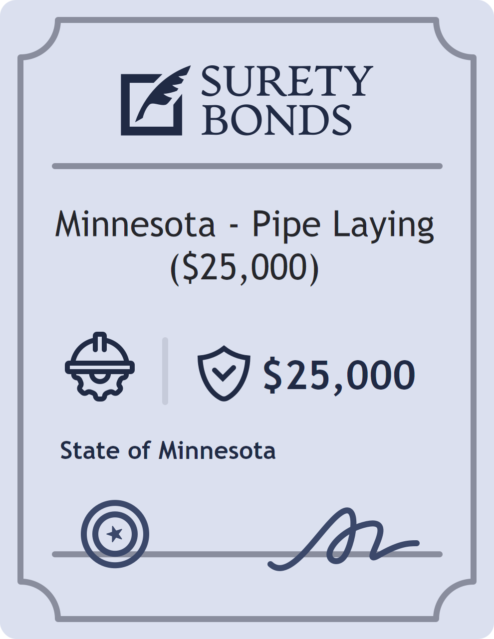 The Minnesota – Pipe Laying ($25,000) is classified as a Contractor Bonds with a $25,000 obligation in Minnesota. Contractor Bonds are surety bonds required for individuals or businesses performing construction work. They guarantee that contractors will comply with building codes, licensing requirements, and contractual obligations. The bond provides financial protection to property owners and the public in cases of poor workmanship, regulatory violations, or unfinished work. The surety reviews financial strength, compliance history, and indemnity support before approving the obligation. Maintaining uninterrupted coverage for the entire 1 Year term is essential; lapses can trigger penalties, contract defaults, or license suspension in Minnesota. Underwriters typically request financial statements, references, and proof of licensing before quoting terms so they can evaluate repayment capacity. Throughout the bond term, the principal must maintain accurate books, respond to regulator inquiries, and remediate any complaints to prevent a claim. Many authorities in Minnesota also require renewal certificates 30 to 60 days in advance, and failure to provide proof can halt permitting or bid submissions. The $25,000 limit demonstrates to customers, partners, and oversight agencies that the bonded party maintains a reliable, surety-backed source of funds dedicated to ongoing compliance. The obligee for this bond is State of Minnesota.
