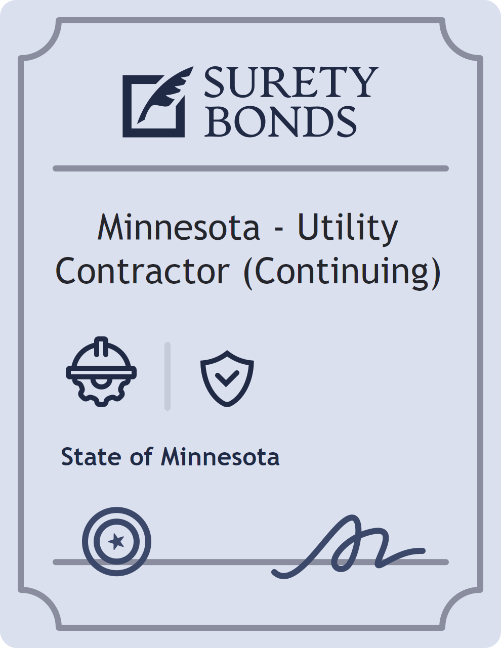 The Minnesota – Utility Contractor (Continuing) is classified as a Contractor Bonds with a $10,000 obligation in Minnesota. Contractor Bonds are surety bonds required for individuals or businesses performing construction work. They guarantee that contractors will comply with building codes, licensing requirements, and contractual obligations. The bond provides financial protection to property owners and the public in cases of poor workmanship, regulatory violations, or unfinished work. The surety reviews financial strength, compliance history, and indemnity support before approving the obligation. Maintaining uninterrupted coverage for the entire 1 Year term is essential; lapses can trigger penalties, contract defaults, or license suspension in Minnesota. Underwriters typically request financial statements, references, and proof of licensing before quoting terms so they can evaluate repayment capacity. Throughout the bond term, the principal must maintain accurate books, respond to regulator inquiries, and remediate any complaints to prevent a claim. Many authorities in Minnesota also require renewal certificates 30 to 60 days in advance, and failure to provide proof can halt permitting or bid submissions. The $10,000 limit demonstrates to customers, partners, and oversight agencies that the bonded party maintains a reliable, surety-backed source of funds dedicated to ongoing compliance. The obligee for this bond is State of Minnesota.