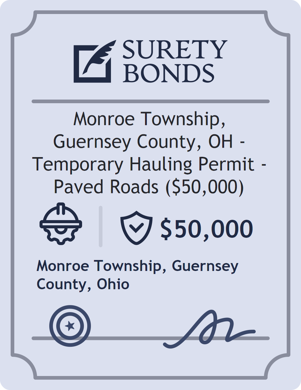 The Monroe Township, Guernsey County, OH – Temporary Hauling Permit – Paved Roads ($50,000) is classified as a Contractor Bonds with a $50,000 obligation in Ohio. Contractor Bonds are surety bonds required for individuals or businesses performing construction work. They guarantee that contractors will comply with building codes, licensing requirements, and contractual obligations. The bond provides financial protection to property owners and the public in cases of poor workmanship, regulatory violations, or unfinished work. The surety reviews financial strength, compliance history, and indemnity support before approving the obligation. Maintaining uninterrupted coverage for the entire 1 Year term is essential; lapses can trigger penalties, contract defaults, or license suspension in Ohio. Underwriters typically request financial statements, references, and proof of licensing before quoting terms so they can evaluate repayment capacity. Throughout the bond term, the principal must maintain accurate books, respond to regulator inquiries, and remediate any complaints to prevent a claim. Many authorities in Ohio also require renewal certificates 30 to 60 days in advance, and failure to provide proof can halt permitting or bid submissions. The $50,000 limit demonstrates to customers, partners, and oversight agencies that the bonded party maintains a reliable, surety-backed source of funds dedicated to ongoing compliance. The obligee for this bond is Monroe Township, Guernsey County.