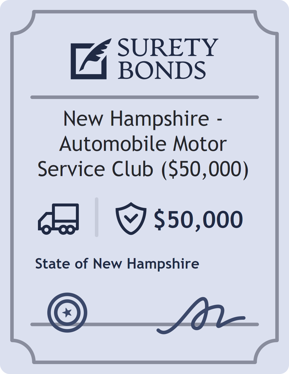 The New Hampshire – Automobile Motor Service Club ($50,000) is a $50,000 surety bond required in New Hampshire. It provides a financial guarantee that the bonded party will satisfy all statutory and contractual obligations related to this bond type. The surety reviews financial strength, compliance history, and indemnity support before approving the obligation. Maintaining uninterrupted coverage for the entire 1 Year term is essential; lapses can trigger penalties, contract defaults, or license suspension in New Hampshire. Underwriters typically request financial statements, references, and proof of licensing before quoting terms so they can evaluate repayment capacity. Throughout the bond term, the principal must maintain accurate books, respond to regulator inquiries, and remediate any complaints to prevent a claim. Many authorities in New Hampshire also require renewal certificates 30 to 60 days in advance, and failure to provide proof can halt permitting or bid submissions. The $50,000 limit demonstrates to customers, partners, and oversight agencies that the bonded party maintains a reliable, surety-backed source of funds dedicated to ongoing compliance. The obligee for this bond is State of New Hampshire.