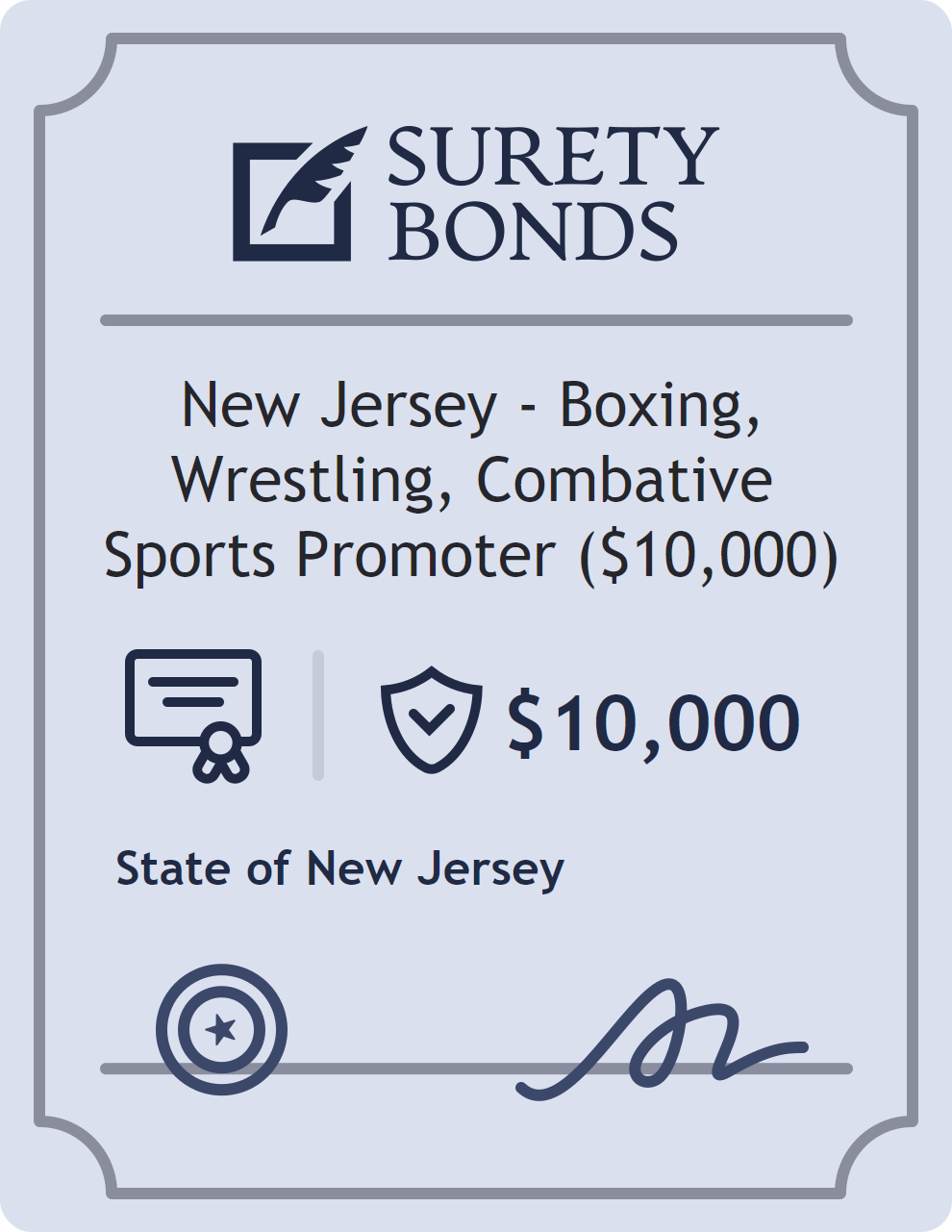 The New Jersey – Boxing, Wrestling, Combative Sports Promoter ($10,000) is classified as a Professional License Bonds with a $10,000 obligation in New Jersey. Professional License Bonds are surety bonds required for licensed professionals across various industries. They guarantee compliance with licensing laws and ethical standards, protecting clients and regulatory bodies from harm. The surety reviews financial strength, compliance history, and indemnity support before approving the obligation. Maintaining uninterrupted coverage for the entire 1 Year term is essential; lapses can trigger penalties, contract defaults, or license suspension in New Jersey. Underwriters typically request financial statements, references, and proof of licensing before quoting terms so they can evaluate repayment capacity. Throughout the bond term, the principal must maintain accurate books, respond to regulator inquiries, and remediate any complaints to prevent a claim. Many authorities in New Jersey also require renewal certificates 30 to 60 days in advance, and failure to provide proof can halt permitting or bid submissions. The $10,000 limit demonstrates to customers, partners, and oversight agencies that the bonded party maintains a reliable, surety-backed source of funds dedicated to ongoing compliance. The obligee for this bond is State of New Jersey.