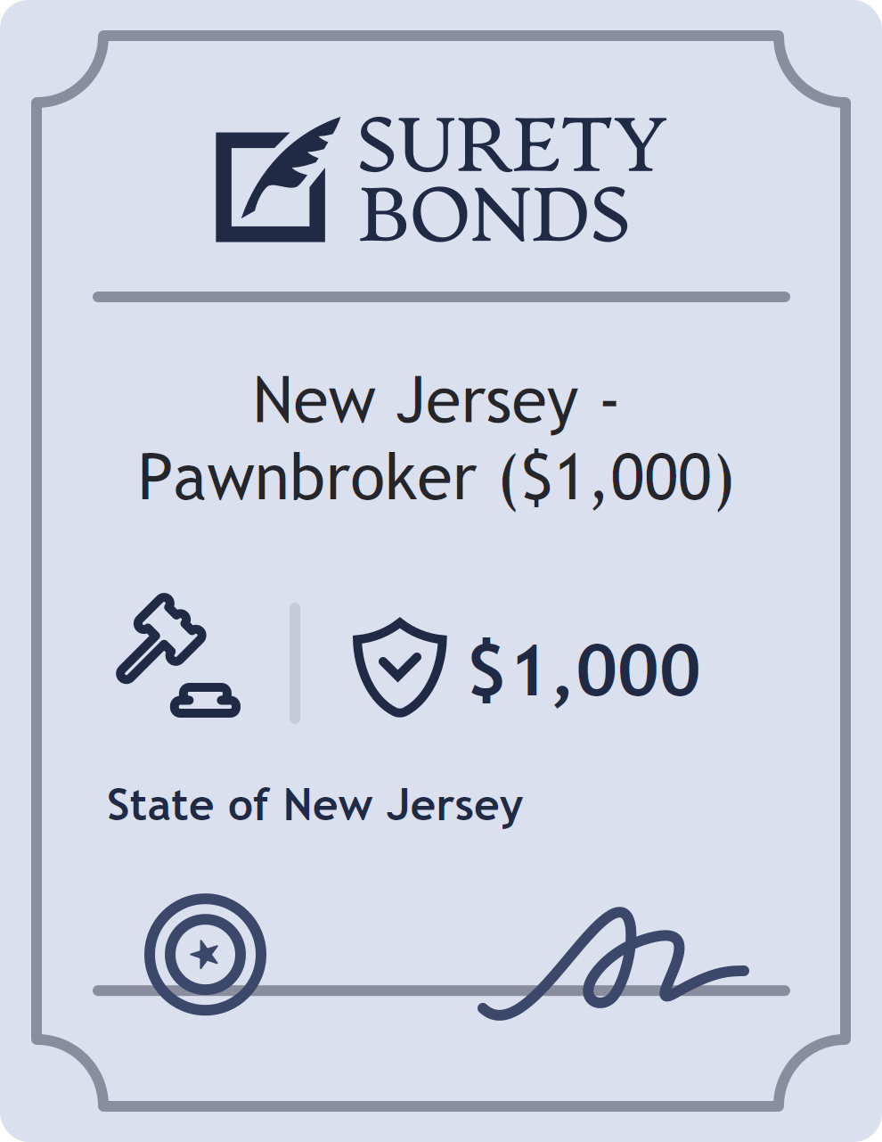 The New Jersey – Pawnbroker ($1,000) is classified as a Legal Bonds with a $1,000 obligation in New Jersey. Legal Bonds are surety bonds associated with court proceedings and legal obligations. They guarantee compliance with court orders, protect parties in litigation, and ensure that fiduciaries perform their duties in accordance with the law. The surety reviews financial strength, compliance history, and indemnity support before approving the obligation. Maintaining uninterrupted coverage for the entire 1 Year term is essential; lapses can trigger penalties, contract defaults, or license suspension in New Jersey. Underwriters typically request financial statements, references, and proof of licensing before quoting terms so they can evaluate repayment capacity. Throughout the bond term, the principal must maintain accurate books, respond to regulator inquiries, and remediate any complaints to prevent a claim. Many authorities in New Jersey also require renewal certificates 30 to 60 days in advance, and failure to provide proof can halt permitting or bid submissions. The $1,000 limit demonstrates to customers, partners, and oversight agencies that the bonded party maintains a reliable, surety-backed source of funds dedicated to ongoing compliance. The obligee for this bond is State of New Jersey.
