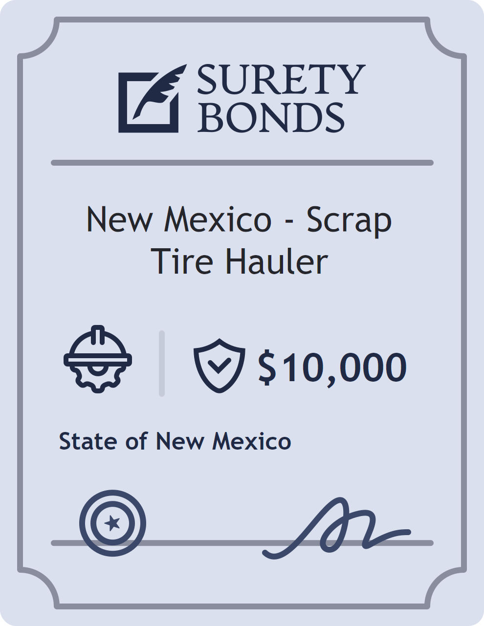 The New Mexico – Scrap Tire Hauler is classified as a Contractor Bonds with a $10,000.00 obligation in New Mexico. Contractor Bonds are surety bonds required for individuals or businesses performing construction work. They guarantee that contractors will comply with building codes, licensing requirements, and contractual obligations. The bond provides financial protection to property owners and the public in cases of poor workmanship, regulatory violations, or unfinished work. The surety reviews financial strength, compliance history, and indemnity support before approving the obligation. Maintaining uninterrupted coverage for the entire 1 Year term is essential; lapses can trigger penalties, contract defaults, or license suspension in New Mexico. Underwriters typically request financial statements, references, and proof of licensing before quoting terms so they can evaluate repayment capacity. Throughout the bond term, the principal must maintain accurate books, respond to regulator inquiries, and remediate any complaints to prevent a claim. Many authorities in New Mexico also require renewal certificates 30 to 60 days in advance, and failure to provide proof can halt permitting or bid submissions. The $10,000.00 limit demonstrates to customers, partners, and oversight agencies that the bonded party maintains a reliable, surety-backed source of funds dedicated to ongoing compliance. The obligee for this bond is State of New Mexico.