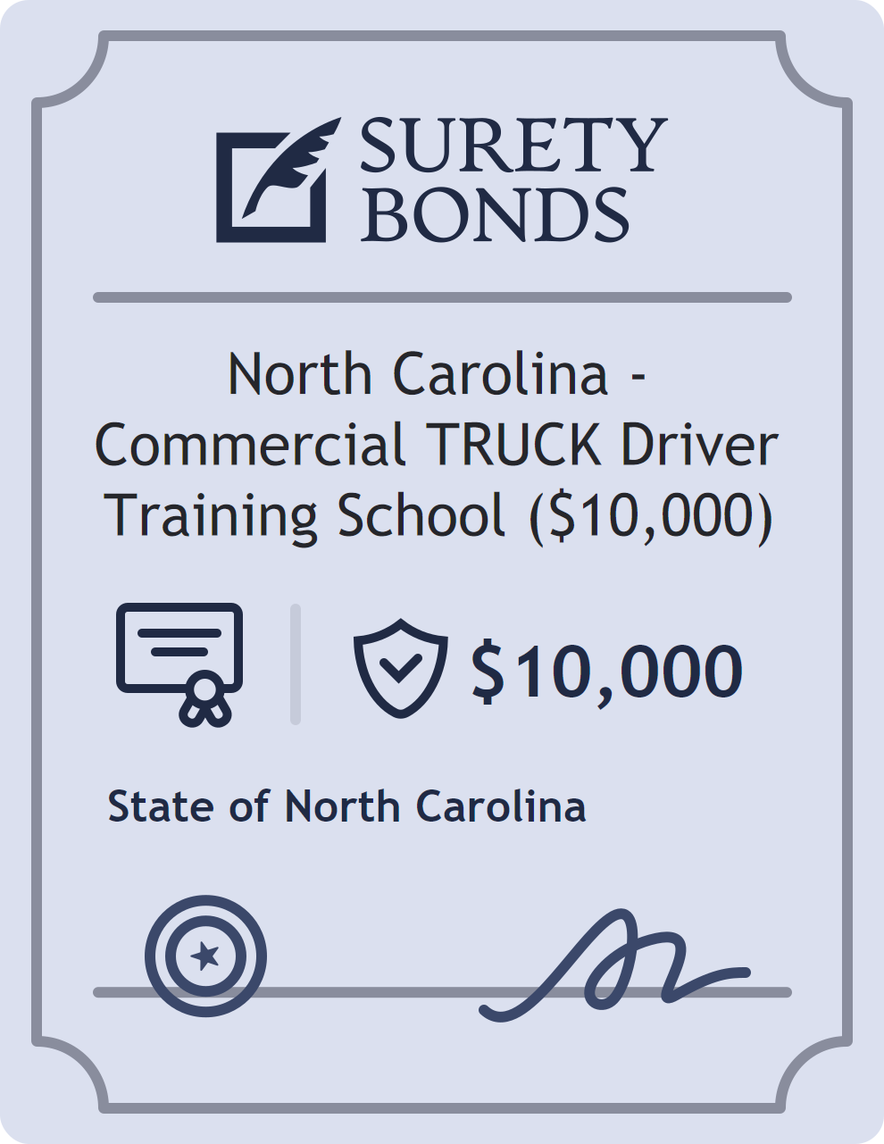 The North Carolina – Commercial TRUCK Driver Training School ($10,000) is classified as a Professional License Bonds with a $10,000 obligation in North Carolina. Professional License Bonds are surety bonds required for licensed professionals across various industries. They guarantee compliance with licensing laws and ethical standards, protecting clients and regulatory bodies from harm. The surety reviews financial strength, compliance history, and indemnity support before approving the obligation. Maintaining uninterrupted coverage for the entire 1 Year term is essential; lapses can trigger penalties, contract defaults, or license suspension in North Carolina. Underwriters typically request financial statements, references, and proof of licensing before quoting terms so they can evaluate repayment capacity. Throughout the bond term, the principal must maintain accurate books, respond to regulator inquiries, and remediate any complaints to prevent a claim. Many authorities in North Carolina also require renewal certificates 30 to 60 days in advance, and failure to provide proof can halt permitting or bid submissions. The $10,000 limit demonstrates to customers, partners, and oversight agencies that the bonded party maintains a reliable, surety-backed source of funds dedicated to ongoing compliance. The obligee for this bond is State of North Carolina.