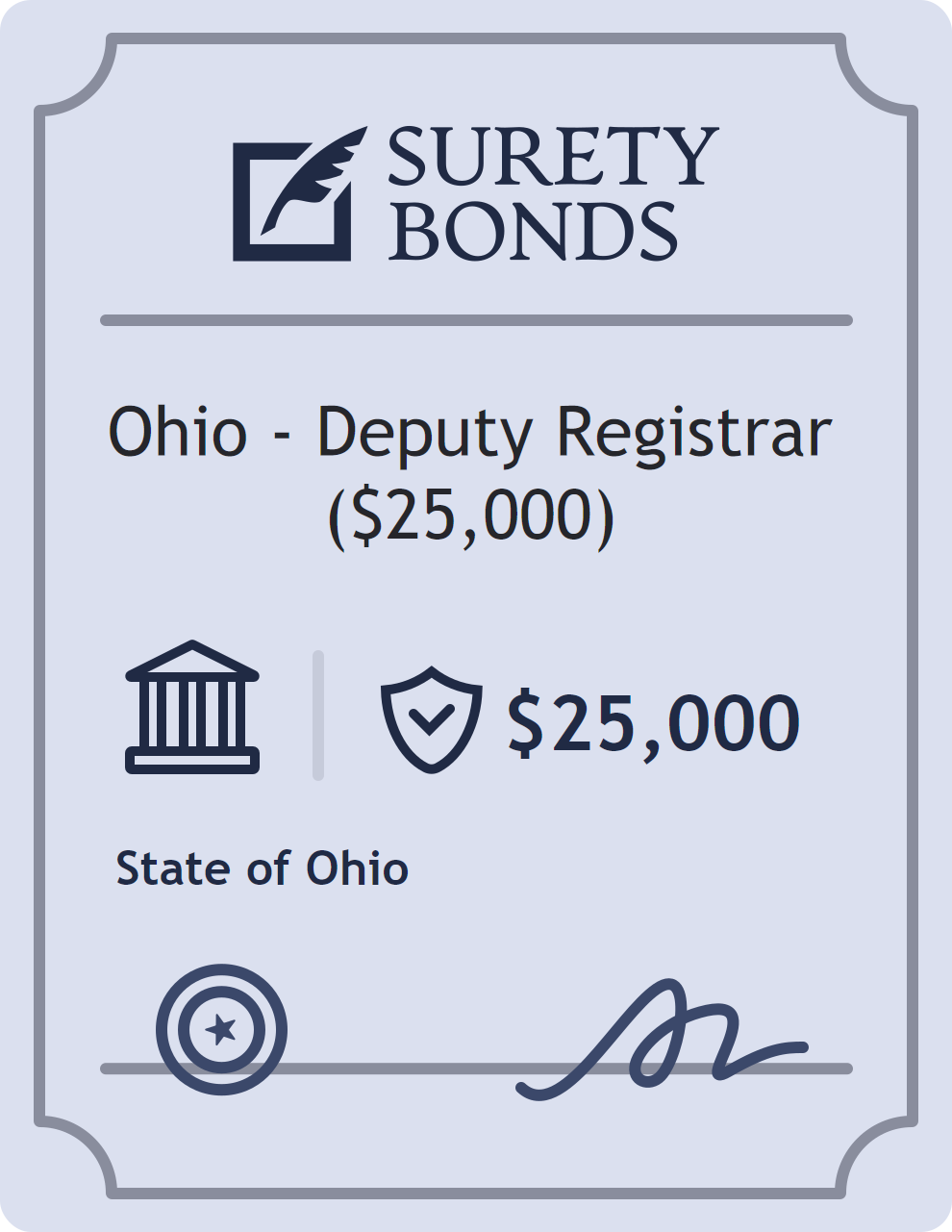 The Ohio – Deputy Registrar ($25,000) is classified as a Government/Public Official Bonds with a $25,000 obligation in Ohio. Government/Public Official Bonds are surety bonds that ensure elected and appointed officials perform their duties faithfully and in accordance with the law. These bonds provide financial protection in cases of misconduct, negligence, or misuse of authority by public officials. The surety reviews financial strength, compliance history, and indemnity support before approving the obligation. Maintaining uninterrupted coverage for the entire 1 Year term is essential; lapses can trigger penalties, contract defaults, or license suspension in Ohio. Underwriters typically request financial statements, references, and proof of licensing before quoting terms so they can evaluate repayment capacity. Throughout the bond term, the principal must maintain accurate books, respond to regulator inquiries, and remediate any complaints to prevent a claim. Many authorities in Ohio also require renewal certificates 30 to 60 days in advance, and failure to provide proof can halt permitting or bid submissions. The $25,000 limit demonstrates to customers, partners, and oversight agencies that the bonded party maintains a reliable, surety-backed source of funds dedicated to ongoing compliance. The obligee for this bond is State of Ohio.