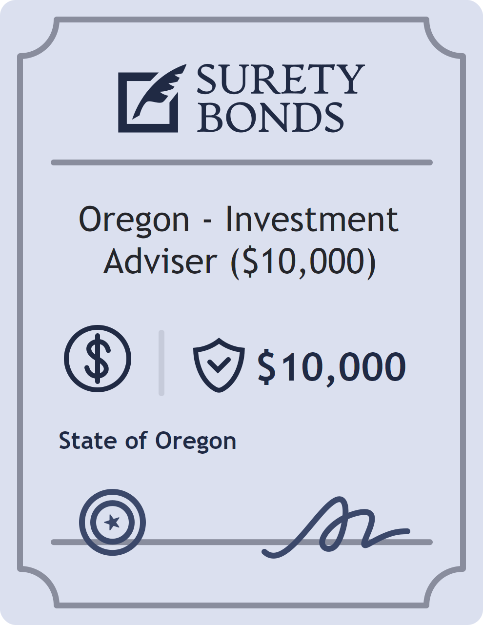 The Oregon – Investment Adviser ($10,000) is classified as a Financial Services Bonds with a $10,000 obligation in Oregon. Financial Services Bonds are surety bonds designed for businesses in the financial industry, including brokers, lenders, and other financial institutions. These bonds guarantee compliance with financial regulations and provide protection against misconduct or fraud. The surety reviews financial strength, compliance history, and indemnity support before approving the obligation. Maintaining uninterrupted coverage for the entire 1 Year term is essential; lapses can trigger penalties, contract defaults, or license suspension in Oregon. Underwriters typically request financial statements, references, and proof of licensing before quoting terms so they can evaluate repayment capacity. Throughout the bond term, the principal must maintain accurate books, respond to regulator inquiries, and remediate any complaints to prevent a claim. Many authorities in Oregon also require renewal certificates 30 to 60 days in advance, and failure to provide proof can halt permitting or bid submissions. The $10,000 limit demonstrates to customers, partners, and oversight agencies that the bonded party maintains a reliable, surety-backed source of funds dedicated to ongoing compliance. The obligee for this bond is State of Oregon.