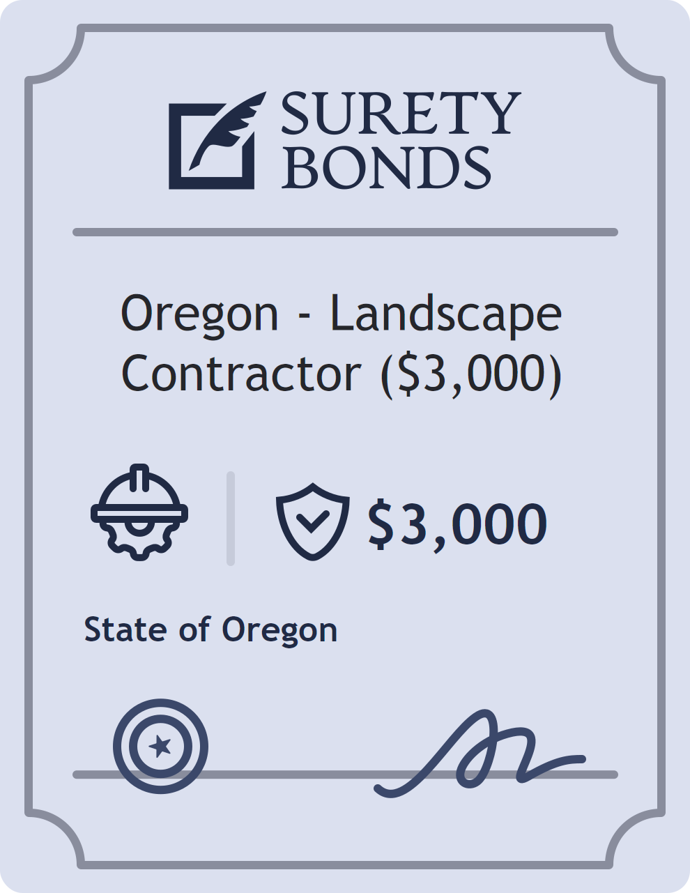 The Oregon – Landscape Contractor ($3,000) is classified as a Contractor Bonds with a $3,000 obligation in Oregon. Contractor Bonds are surety bonds required for individuals or businesses performing construction work. They guarantee that contractors will comply with building codes, licensing requirements, and contractual obligations. The bond provides financial protection to property owners and the public in cases of poor workmanship, regulatory violations, or unfinished work. The surety reviews financial strength, compliance history, and indemnity support before approving the obligation. Maintaining uninterrupted coverage for the entire 1 Year term is essential; lapses can trigger penalties, contract defaults, or license suspension in Oregon. Underwriters typically request financial statements, references, and proof of licensing before quoting terms so they can evaluate repayment capacity. Throughout the bond term, the principal must maintain accurate books, respond to regulator inquiries, and remediate any complaints to prevent a claim. Many authorities in Oregon also require renewal certificates 30 to 60 days in advance, and failure to provide proof can halt permitting or bid submissions. The $3,000 limit demonstrates to customers, partners, and oversight agencies that the bonded party maintains a reliable, surety-backed source of funds dedicated to ongoing compliance. The obligee for this bond is State of Oregon.