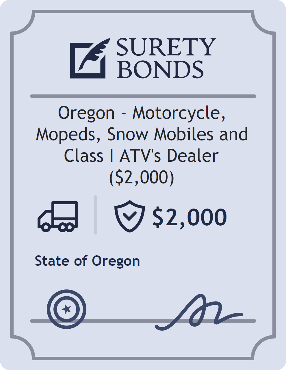 The Oregon – Motorcycle, Mopeds, Snow Mobiles and Class I ATV’s Dealer ($2,000) is a $2,000 surety bond required in Oregon. It provides a financial guarantee that the bonded party will satisfy all statutory and contractual obligations related to this bond type. The surety reviews financial strength, compliance history, and indemnity support before approving the obligation. Maintaining uninterrupted coverage for the entire 1 Year term is essential; lapses can trigger penalties, contract defaults, or license suspension in Oregon. Underwriters typically request financial statements, references, and proof of licensing before quoting terms so they can evaluate repayment capacity. Throughout the bond term, the principal must maintain accurate books, respond to regulator inquiries, and remediate any complaints to prevent a claim. Many authorities in Oregon also require renewal certificates 30 to 60 days in advance, and failure to provide proof can halt permitting or bid submissions. The $2,000 limit demonstrates to customers, partners, and oversight agencies that the bonded party maintains a reliable, surety-backed source of funds dedicated to ongoing compliance. The obligee for this bond is State of Oregon.