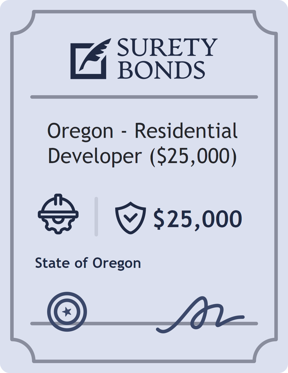 The Oregon – Residential Developer ($25,000) is classified as a Contractor Bonds with a $25,000 obligation in Oregon. Contractor Bonds are surety bonds required for individuals or businesses performing construction work. They guarantee that contractors will comply with building codes, licensing requirements, and contractual obligations. The bond provides financial protection to property owners and the public in cases of poor workmanship, regulatory violations, or unfinished work. The surety reviews financial strength, compliance history, and indemnity support before approving the obligation. Maintaining uninterrupted coverage for the entire 1 Year term is essential; lapses can trigger penalties, contract defaults, or license suspension in Oregon. Underwriters typically request financial statements, references, and proof of licensing before quoting terms so they can evaluate repayment capacity. Throughout the bond term, the principal must maintain accurate books, respond to regulator inquiries, and remediate any complaints to prevent a claim. Many authorities in Oregon also require renewal certificates 30 to 60 days in advance, and failure to provide proof can halt permitting or bid submissions. The $25,000 limit demonstrates to customers, partners, and oversight agencies that the bonded party maintains a reliable, surety-backed source of funds dedicated to ongoing compliance. The obligee for this bond is State of Oregon.
