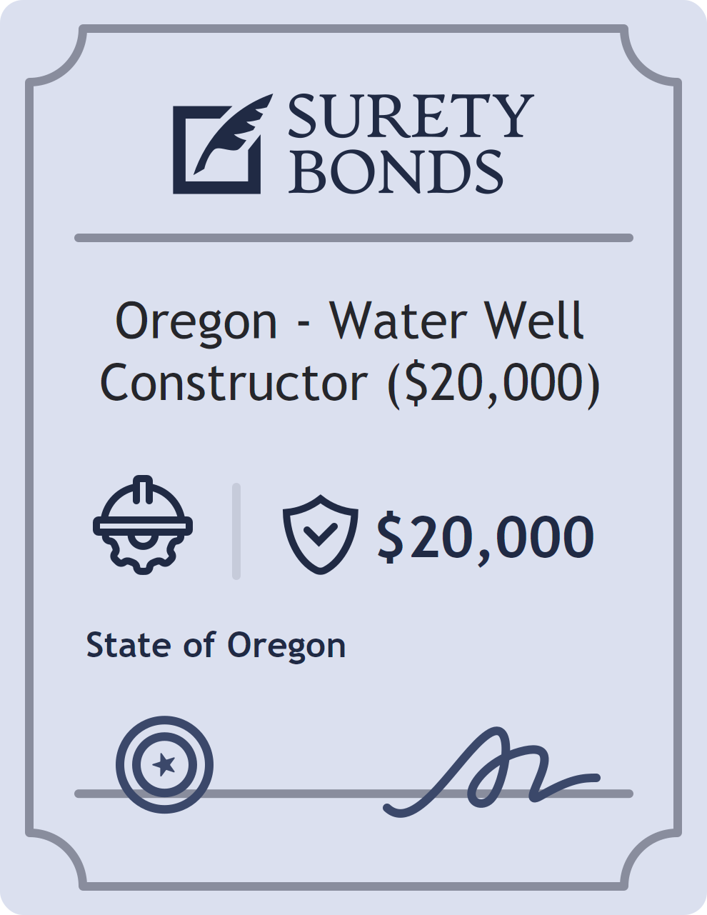 The Oregon – Water Well Constructor ($20,000) is classified as a Contractor Bonds with a $20,000 obligation in Oregon. Contractor Bonds are surety bonds required for individuals or businesses performing construction work. They guarantee that contractors will comply with building codes, licensing requirements, and contractual obligations. The bond provides financial protection to property owners and the public in cases of poor workmanship, regulatory violations, or unfinished work. The surety reviews financial strength, compliance history, and indemnity support before approving the obligation. Maintaining uninterrupted coverage for the entire 1 Year term is essential; lapses can trigger penalties, contract defaults, or license suspension in Oregon. Underwriters typically request financial statements, references, and proof of licensing before quoting terms so they can evaluate repayment capacity. Throughout the bond term, the principal must maintain accurate books, respond to regulator inquiries, and remediate any complaints to prevent a claim. Many authorities in Oregon also require renewal certificates 30 to 60 days in advance, and failure to provide proof can halt permitting or bid submissions. The $20,000 limit demonstrates to customers, partners, and oversight agencies that the bonded party maintains a reliable, surety-backed source of funds dedicated to ongoing compliance. The obligee for this bond is State of Oregon.