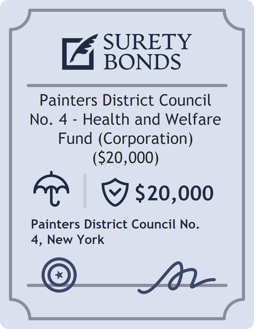 The Painters District Council No. 4 – Health and Welfare Fund (Corporation) ($20,000) is classified as a Insurance Bonds with a $20,000 obligation in New York. Insurance Bonds are surety bonds required for insurance professionals and agencies. They guarantee that agents comply with licensing laws, ethical standards, and financial regulations, providing protection for clients and regulatory bodies. The surety reviews financial strength, compliance history, and indemnity support before approving the obligation. Maintaining uninterrupted coverage for the entire 1 Year term is essential; lapses can trigger penalties, contract defaults, or license suspension in New York. Underwriters typically request financial statements, references, and proof of licensing before quoting terms so they can evaluate repayment capacity. Throughout the bond term, the principal must maintain accurate books, respond to regulator inquiries, and remediate any complaints to prevent a claim. Many authorities in New York also require renewal certificates 30 to 60 days in advance, and failure to provide proof can halt permitting or bid submissions. The $20,000 limit demonstrates to customers, partners, and oversight agencies that the bonded party maintains a reliable, surety-backed source of funds dedicated to ongoing compliance. The obligee for this bond is Painters District Council No. 4.