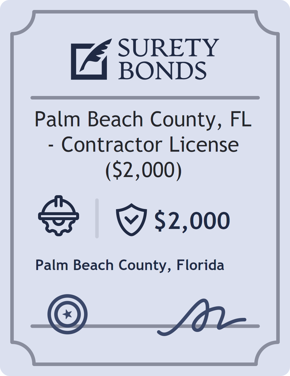 The Palm Beach County, FL – Contractor License ($2,000) is classified as a Contractor Bonds with a $2,000 obligation in Florida. Contractor Bonds are surety bonds required for individuals or businesses performing construction work. They guarantee that contractors will comply with building codes, licensing requirements, and contractual obligations. The bond provides financial protection to property owners and the public in cases of poor workmanship, regulatory violations, or unfinished work. The surety reviews financial strength, compliance history, and indemnity support before approving the obligation. Maintaining uninterrupted coverage for the entire 1 Year term is essential; lapses can trigger penalties, contract defaults, or license suspension in Florida. Underwriters typically request financial statements, references, and proof of licensing before quoting terms so they can evaluate repayment capacity. Throughout the bond term, the principal must maintain accurate books, respond to regulator inquiries, and remediate any complaints to prevent a claim. Many authorities in Florida also require renewal certificates 30 to 60 days in advance, and failure to provide proof can halt permitting or bid submissions. The $2,000 limit demonstrates to customers, partners, and oversight agencies that the bonded party maintains a reliable, surety-backed source of funds dedicated to ongoing compliance. The obligee for this bond is Palm Beach County.