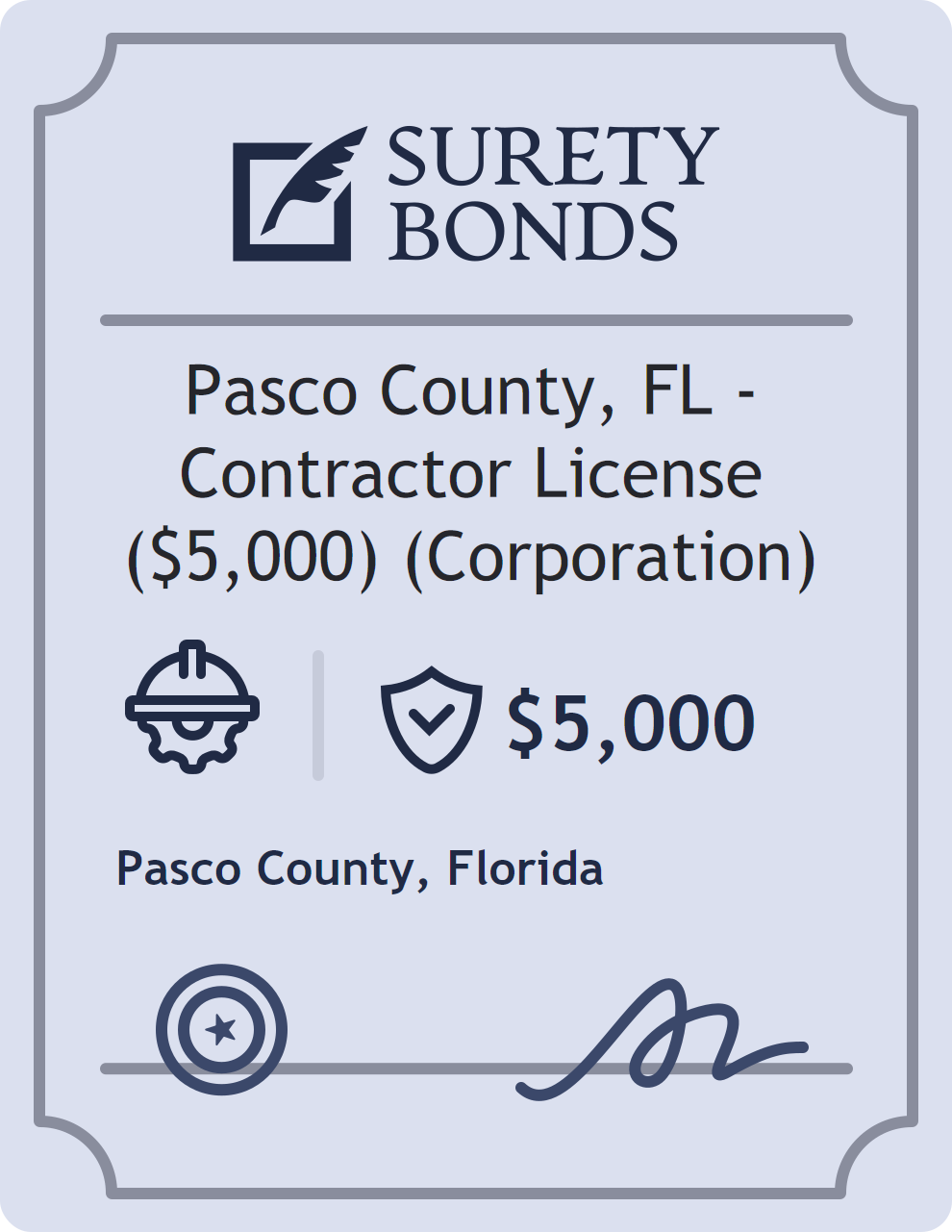 The Pasco County, FL – Contractor License ($5,000) (Corporation) is classified as a Contractor Bonds with a $5,000 obligation in Florida. Contractor Bonds are surety bonds required for individuals or businesses performing construction work. They guarantee that contractors will comply with building codes, licensing requirements, and contractual obligations. The bond provides financial protection to property owners and the public in cases of poor workmanship, regulatory violations, or unfinished work. The surety reviews financial strength, compliance history, and indemnity support before approving the obligation. Maintaining uninterrupted coverage for the entire 1 Year term is essential; lapses can trigger penalties, contract defaults, or license suspension in Florida. Underwriters typically request financial statements, references, and proof of licensing before quoting terms so they can evaluate repayment capacity. Throughout the bond term, the principal must maintain accurate books, respond to regulator inquiries, and remediate any complaints to prevent a claim. Many authorities in Florida also require renewal certificates 30 to 60 days in advance, and failure to provide proof can halt permitting or bid submissions. The $5,000 limit demonstrates to customers, partners, and oversight agencies that the bonded party maintains a reliable, surety-backed source of funds dedicated to ongoing compliance. The obligee for this bond is Pasco County.