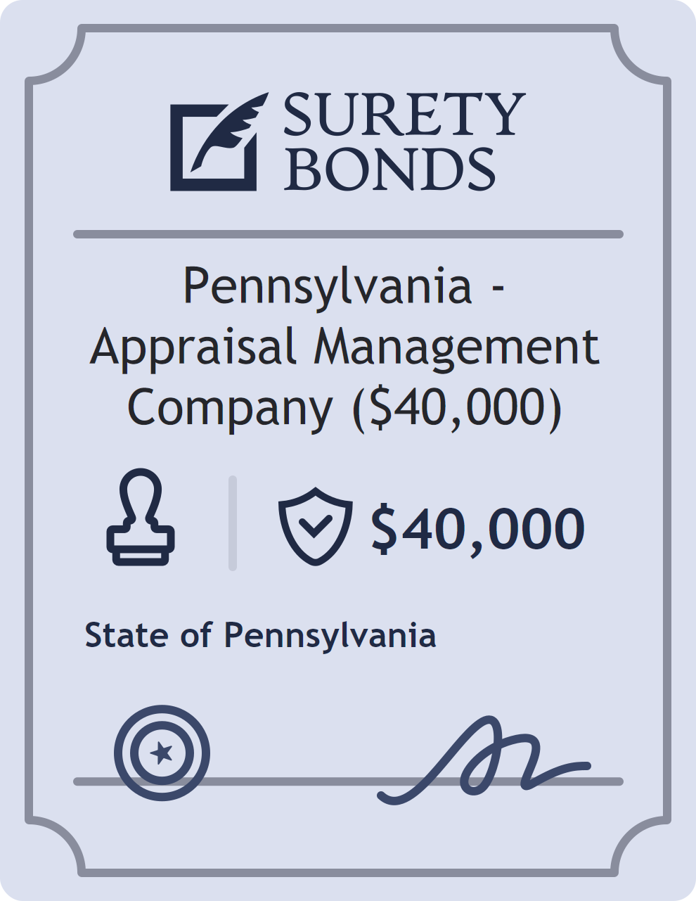 The Pennsylvania – Appraisal Management Company ($40,000) is classified as a Notary Bonds with a $40,000 obligation in Pennsylvania. Notary Bonds are surety bonds required for individuals commissioned as notaries public. They guarantee that notaries will perform their duties faithfully, lawfully, and without misconduct, protecting the public from errors or fraud. The surety reviews financial strength, compliance history, and indemnity support before approving the obligation. Maintaining uninterrupted coverage for the entire 1 Year term is essential; lapses can trigger penalties, contract defaults, or license suspension in Pennsylvania. Underwriters typically request financial statements, references, and proof of licensing before quoting terms so they can evaluate repayment capacity. Throughout the bond term, the principal must maintain accurate books, respond to regulator inquiries, and remediate any complaints to prevent a claim. Many authorities in Pennsylvania also require renewal certificates 30 to 60 days in advance, and failure to provide proof can halt permitting or bid submissions. The $40,000 limit demonstrates to customers, partners, and oversight agencies that the bonded party maintains a reliable, surety-backed source of funds dedicated to ongoing compliance. The obligee for this bond is State of Pennsylvania.