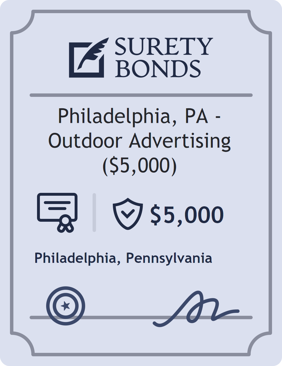 The Philadelphia, PA – Outdoor Advertising ($5,000) is classified as a Professional License Bonds with a $5,000 obligation in Pennsylvania. Professional License Bonds are surety bonds required for licensed professionals across various industries. They guarantee compliance with licensing laws and ethical standards, protecting clients and regulatory bodies from harm. The surety reviews financial strength, compliance history, and indemnity support before approving the obligation. Maintaining uninterrupted coverage for the entire 1 Year term is essential; lapses can trigger penalties, contract defaults, or license suspension in Pennsylvania. Underwriters typically request financial statements, references, and proof of licensing before quoting terms so they can evaluate repayment capacity. Throughout the bond term, the principal must maintain accurate books, respond to regulator inquiries, and remediate any complaints to prevent a claim. Many authorities in Pennsylvania also require renewal certificates 30 to 60 days in advance, and failure to provide proof can halt permitting or bid submissions. The $5,000 limit demonstrates to customers, partners, and oversight agencies that the bonded party maintains a reliable, surety-backed source of funds dedicated to ongoing compliance. The obligee for this bond is Philadelphia.