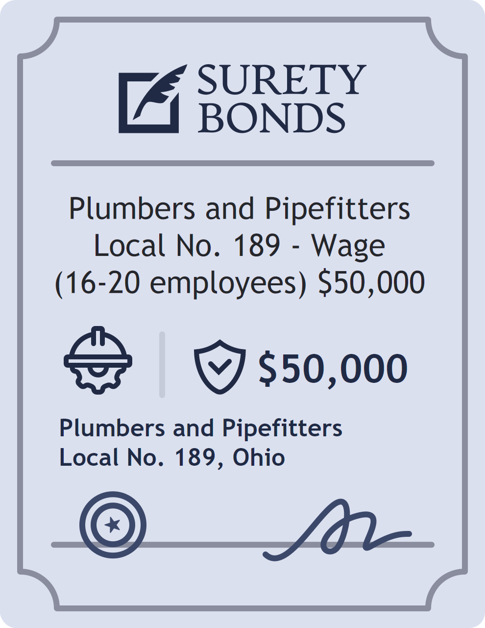 The Plumbers and Pipefitters Local No. 189 – Wage (16-20 employees) $50,000 is classified as a Contractor Bonds with a $50,000 obligation in Ohio. Contractor Bonds are surety bonds required for individuals or businesses performing construction work. They guarantee that contractors will comply with building codes, licensing requirements, and contractual obligations. The bond provides financial protection to property owners and the public in cases of poor workmanship, regulatory violations, or unfinished work. The surety reviews financial strength, compliance history, and indemnity support before approving the obligation. Maintaining uninterrupted coverage for the entire 1 Year term is essential; lapses can trigger penalties, contract defaults, or license suspension in Ohio. Underwriters typically request financial statements, references, and proof of licensing before quoting terms so they can evaluate repayment capacity. Throughout the bond term, the principal must maintain accurate books, respond to regulator inquiries, and remediate any complaints to prevent a claim. Many authorities in Ohio also require renewal certificates 30 to 60 days in advance, and failure to provide proof can halt permitting or bid submissions. The $50,000 limit demonstrates to customers, partners, and oversight agencies that the bonded party maintains a reliable, surety-backed source of funds dedicated to ongoing compliance. The obligee for this bond is Plumbers and Pipefitters Local No. 189.