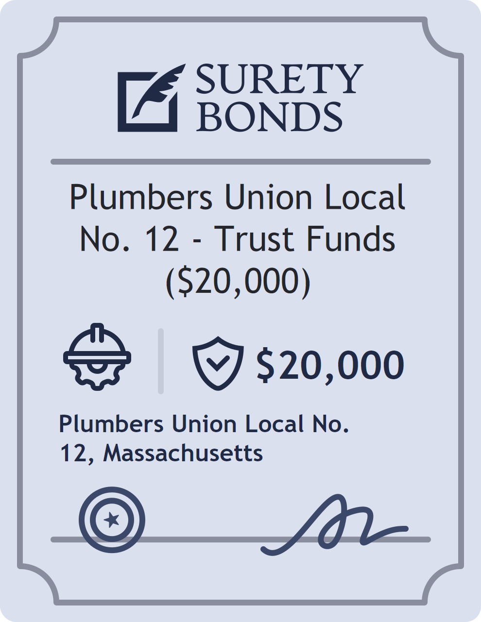 The Plumbers Union Local No. 12 – Trust Funds ($20,000) is classified as a Contractor Bonds with a $20,000 obligation in Massachusetts. Contractor Bonds are surety bonds required for individuals or businesses performing construction work. They guarantee that contractors will comply with building codes, licensing requirements, and contractual obligations. The bond provides financial protection to property owners and the public in cases of poor workmanship, regulatory violations, or unfinished work. The surety reviews financial strength, compliance history, and indemnity support before approving the obligation. Maintaining uninterrupted coverage for the entire 1 Year term is essential; lapses can trigger penalties, contract defaults, or license suspension in Massachusetts. Underwriters typically request financial statements, references, and proof of licensing before quoting terms so they can evaluate repayment capacity. Throughout the bond term, the principal must maintain accurate books, respond to regulator inquiries, and remediate any complaints to prevent a claim. Many authorities in Massachusetts also require renewal certificates 30 to 60 days in advance, and failure to provide proof can halt permitting or bid submissions. The $20,000 limit demonstrates to customers, partners, and oversight agencies that the bonded party maintains a reliable, surety-backed source of funds dedicated to ongoing compliance. The obligee for this bond is Plumbers Union Local No. 12.