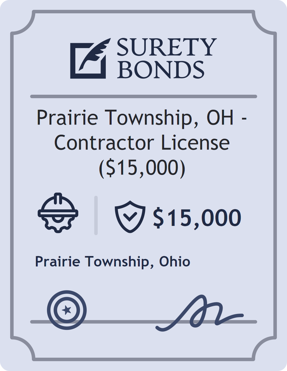 The Prairie Township, OH – Contractor License ($15,000) is classified as a Contractor Bonds with a $15,000 obligation in Ohio. Contractor Bonds are surety bonds required for individuals or businesses performing construction work. They guarantee that contractors will comply with building codes, licensing requirements, and contractual obligations. The bond provides financial protection to property owners and the public in cases of poor workmanship, regulatory violations, or unfinished work. The surety reviews financial strength, compliance history, and indemnity support before approving the obligation. Maintaining uninterrupted coverage for the entire 1 Year term is essential; lapses can trigger penalties, contract defaults, or license suspension in Ohio. Underwriters typically request financial statements, references, and proof of licensing before quoting terms so they can evaluate repayment capacity. Throughout the bond term, the principal must maintain accurate books, respond to regulator inquiries, and remediate any complaints to prevent a claim. Many authorities in Ohio also require renewal certificates 30 to 60 days in advance, and failure to provide proof can halt permitting or bid submissions. The $15,000 limit demonstrates to customers, partners, and oversight agencies that the bonded party maintains a reliable, surety-backed source of funds dedicated to ongoing compliance. The obligee for this bond is Prairie Township.