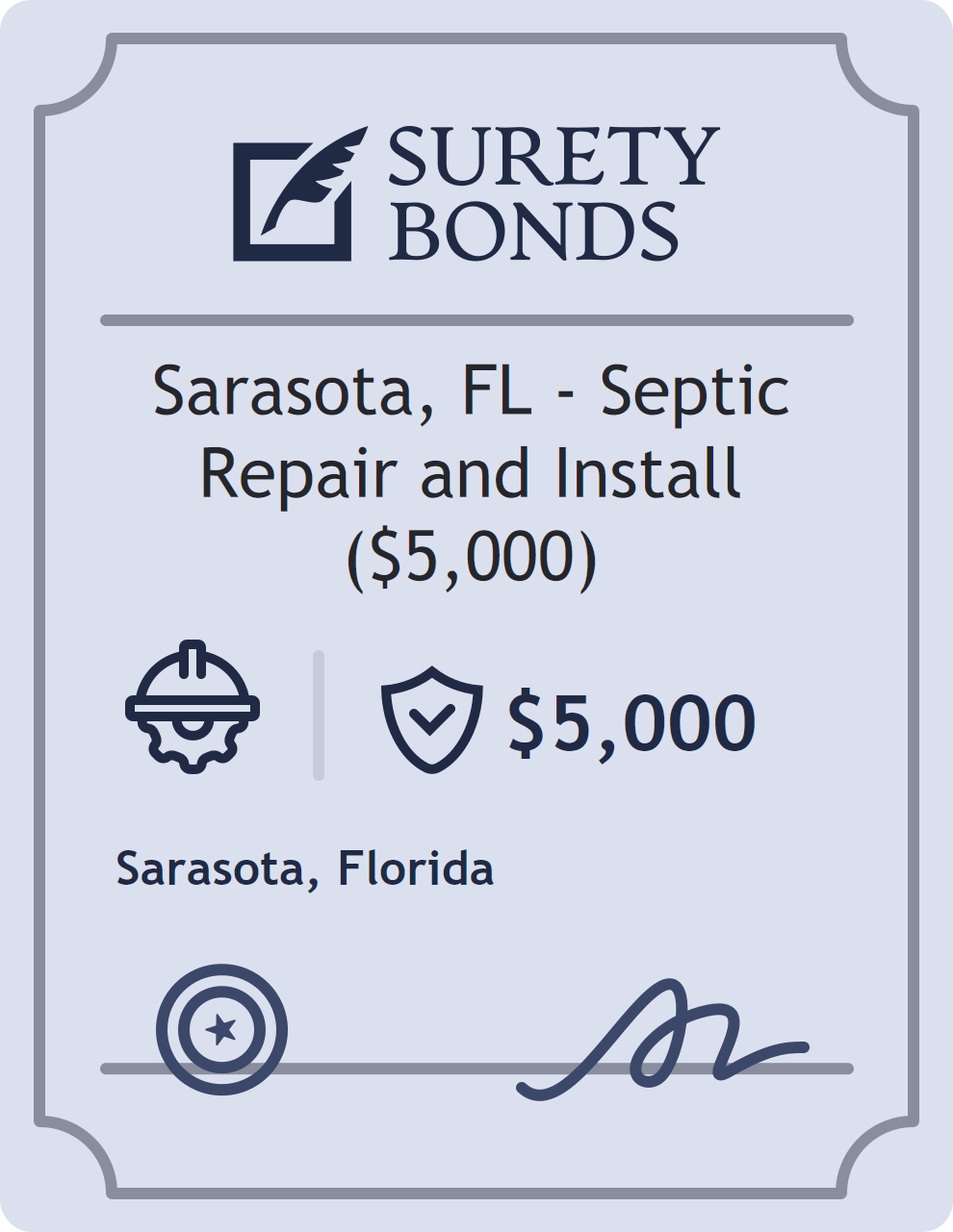The Sarasota, FL – Septic Repair and Install ($5,000) is classified as a Contractor Bonds with a $5,000 obligation in Florida. Contractor Bonds are surety bonds required for individuals or businesses performing construction work. They guarantee that contractors will comply with building codes, licensing requirements, and contractual obligations. The bond provides financial protection to property owners and the public in cases of poor workmanship, regulatory violations, or unfinished work. The surety reviews financial strength, compliance history, and indemnity support before approving the obligation. Maintaining uninterrupted coverage for the entire 1 Year term is essential; lapses can trigger penalties, contract defaults, or license suspension in Florida. Underwriters typically request financial statements, references, and proof of licensing before quoting terms so they can evaluate repayment capacity. Throughout the bond term, the principal must maintain accurate books, respond to regulator inquiries, and remediate any complaints to prevent a claim. Many authorities in Florida also require renewal certificates 30 to 60 days in advance, and failure to provide proof can halt permitting or bid submissions. The $5,000 limit demonstrates to customers, partners, and oversight agencies that the bonded party maintains a reliable, surety-backed source of funds dedicated to ongoing compliance. The obligee for this bond is Sarasota.