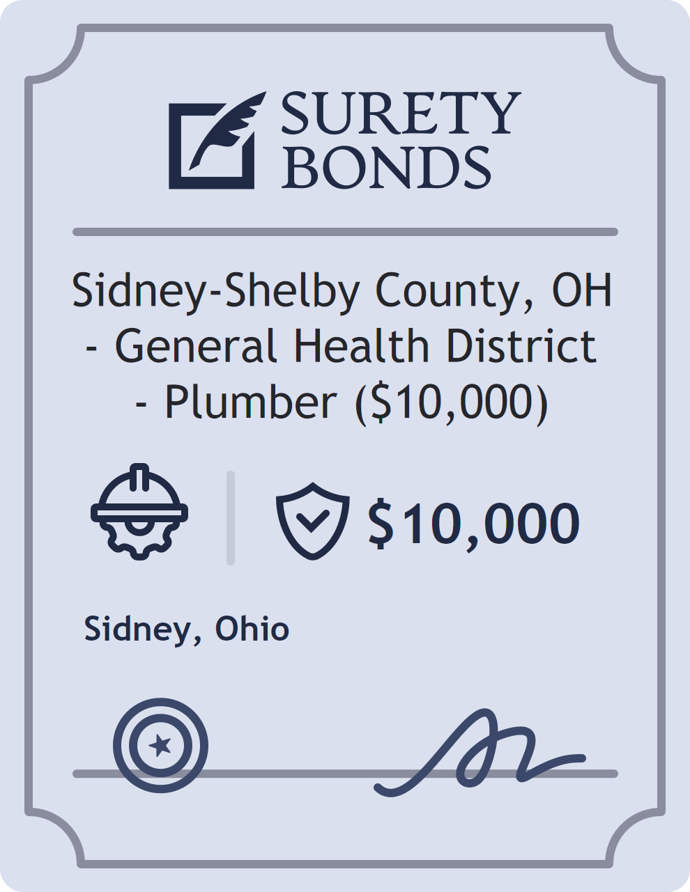 The Sidney-Shelby County, OH – General Health District – Plumber ($10,000) is classified as a Contractor Bonds with a $10,000 obligation in Ohio. Contractor Bonds are surety bonds required for individuals or businesses performing construction work. They guarantee that contractors will comply with building codes, licensing requirements, and contractual obligations. The bond provides financial protection to property owners and the public in cases of poor workmanship, regulatory violations, or unfinished work. The surety reviews financial strength, compliance history, and indemnity support before approving the obligation. Maintaining uninterrupted coverage for the entire 1 Year term is essential; lapses can trigger penalties, contract defaults, or license suspension in Ohio. Underwriters typically request financial statements, references, and proof of licensing before quoting terms so they can evaluate repayment capacity. Throughout the bond term, the principal must maintain accurate books, respond to regulator inquiries, and remediate any complaints to prevent a claim. Many authorities in Ohio also require renewal certificates 30 to 60 days in advance, and failure to provide proof can halt permitting or bid submissions. The $10,000 limit demonstrates to customers, partners, and oversight agencies that the bonded party maintains a reliable, surety-backed source of funds dedicated to ongoing compliance. The obligee for this bond is Sidney.