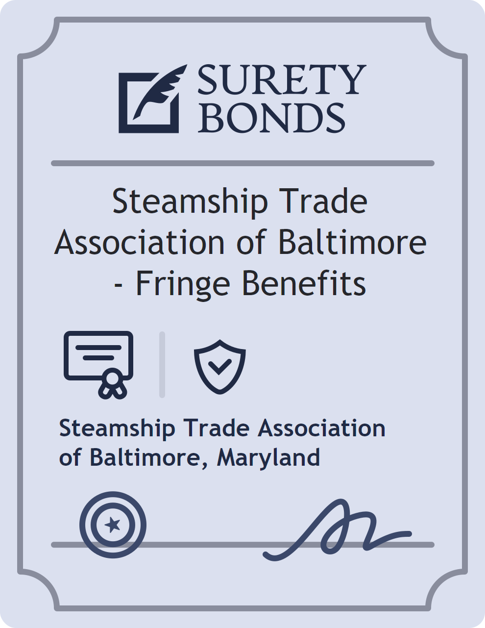 The Steamship Trade Association of Baltimore – Fringe Benefits is classified as a Professional License Bonds with a $10,000 obligation in Maryland. Professional License Bonds are surety bonds required for licensed professionals across various industries. They guarantee compliance with licensing laws and ethical standards, protecting clients and regulatory bodies from harm. The surety reviews financial strength, compliance history, and indemnity support before approving the obligation. Maintaining uninterrupted coverage for the entire 1 Year term is essential; lapses can trigger penalties, contract defaults, or license suspension in Maryland. Underwriters typically request financial statements, references, and proof of licensing before quoting terms so they can evaluate repayment capacity. Throughout the bond term, the principal must maintain accurate books, respond to regulator inquiries, and remediate any complaints to prevent a claim. Many authorities in Maryland also require renewal certificates 30 to 60 days in advance, and failure to provide proof can halt permitting or bid submissions. The $10,000 limit demonstrates to customers, partners, and oversight agencies that the bonded party maintains a reliable, surety-backed source of funds dedicated to ongoing compliance. The obligee for this bond is Steamship Trade Association of Baltimore.