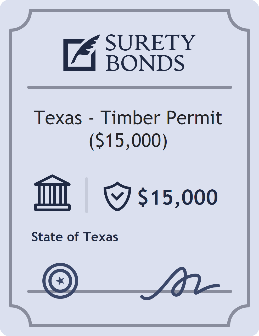 The Texas – Timber Permit ($15,000) is classified as a Government/Public Official Bonds with a $15,000 obligation in Texas. Government/Public Official Bonds are surety bonds that ensure elected and appointed officials perform their duties faithfully and in accordance with the law. These bonds provide financial protection in cases of misconduct, negligence, or misuse of authority by public officials. The surety reviews financial strength, compliance history, and indemnity support before approving the obligation. Maintaining uninterrupted coverage for the entire 1 Year term is essential; lapses can trigger penalties, contract defaults, or license suspension in Texas. Underwriters typically request financial statements, references, and proof of licensing before quoting terms so they can evaluate repayment capacity. Throughout the bond term, the principal must maintain accurate books, respond to regulator inquiries, and remediate any complaints to prevent a claim. Many authorities in Texas also require renewal certificates 30 to 60 days in advance, and failure to provide proof can halt permitting or bid submissions. The $15,000 limit demonstrates to customers, partners, and oversight agencies that the bonded party maintains a reliable, surety-backed source of funds dedicated to ongoing compliance. The obligee for this bond is State of Texas.