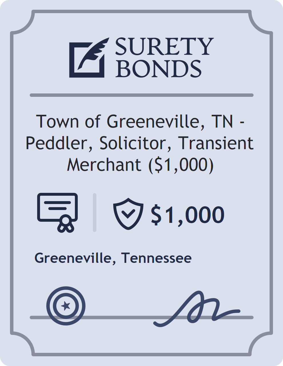 The Town of Greeneville, TN – Peddler, Solicitor, Transient Merchant ($1,000) is classified as a Professional License Bonds with a $1,000 obligation in Tennessee. Professional License Bonds are surety bonds required for licensed professionals across various industries. They guarantee compliance with licensing laws and ethical standards, protecting clients and regulatory bodies from harm. The surety reviews financial strength, compliance history, and indemnity support before approving the obligation. Maintaining uninterrupted coverage for the entire 1 Year term is essential; lapses can trigger penalties, contract defaults, or license suspension in Tennessee. Underwriters typically request financial statements, references, and proof of licensing before quoting terms so they can evaluate repayment capacity. Throughout the bond term, the principal must maintain accurate books, respond to regulator inquiries, and remediate any complaints to prevent a claim. Many authorities in Tennessee also require renewal certificates 30 to 60 days in advance, and failure to provide proof can halt permitting or bid submissions. The $1,000 limit demonstrates to customers, partners, and oversight agencies that the bonded party maintains a reliable, surety-backed source of funds dedicated to ongoing compliance. The obligee for this bond is Greeneville.
