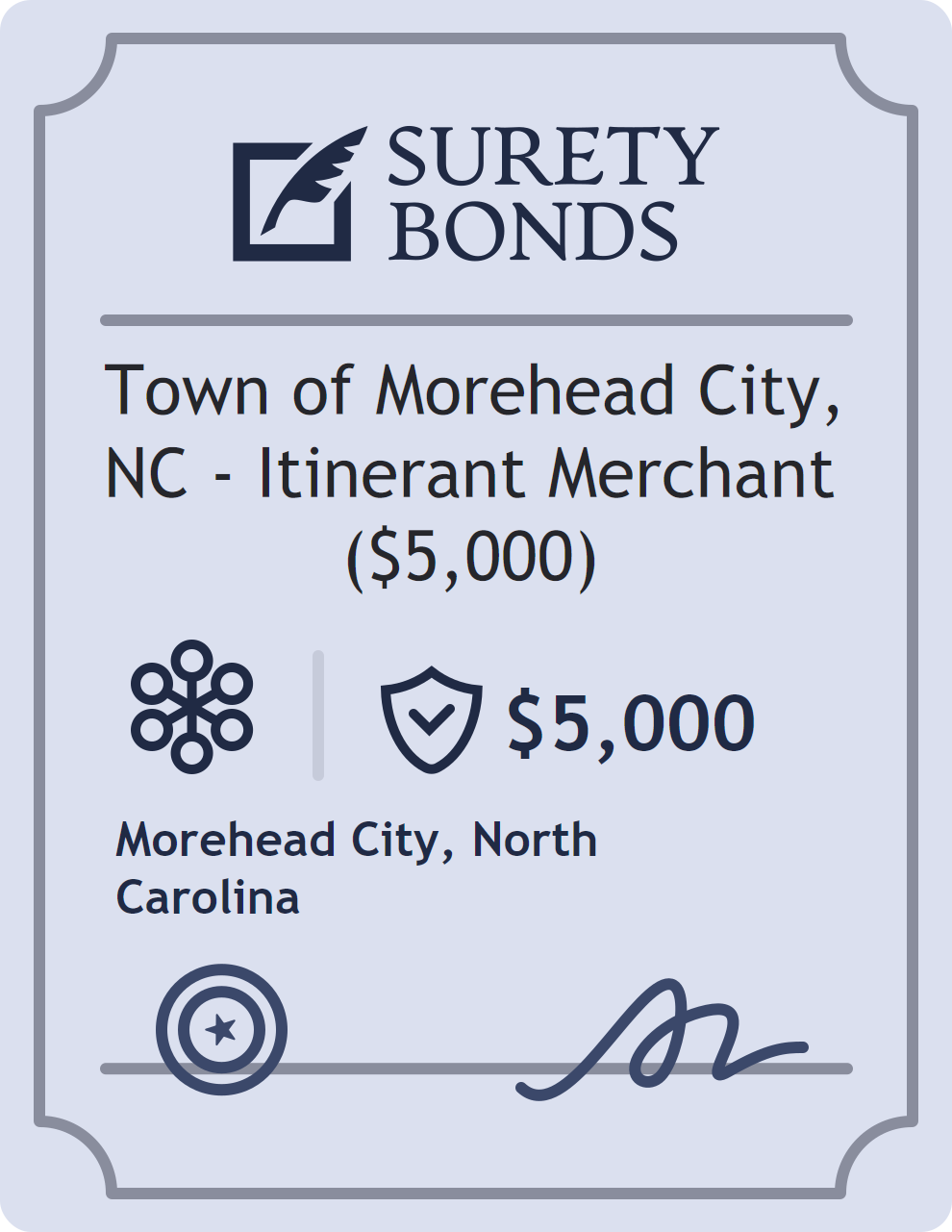 The Town of Morehead City, NC – Itinerant Merchant ($5,000) is classified as a Miscellaneous Bonds with a $5,000 obligation in North Carolina. Miscellaneous Bonds cover a wide range of non-standard surety bond requirements. They act as financial protection in cases where state or federal regulations require assurance of compliance and ethical conduct. The surety reviews financial strength, compliance history, and indemnity support before approving the obligation. Maintaining uninterrupted coverage for the entire 1 Year term is essential; lapses can trigger penalties, contract defaults, or license suspension in North Carolina. Underwriters typically request financial statements, references, and proof of licensing before quoting terms so they can evaluate repayment capacity. Throughout the bond term, the principal must maintain accurate books, respond to regulator inquiries, and remediate any complaints to prevent a claim. Many authorities in North Carolina also require renewal certificates 30 to 60 days in advance, and failure to provide proof can halt permitting or bid submissions. The $5,000 limit demonstrates to customers, partners, and oversight agencies that the bonded party maintains a reliable, surety-backed source of funds dedicated to ongoing compliance. The obligee for this bond is Morehead City.