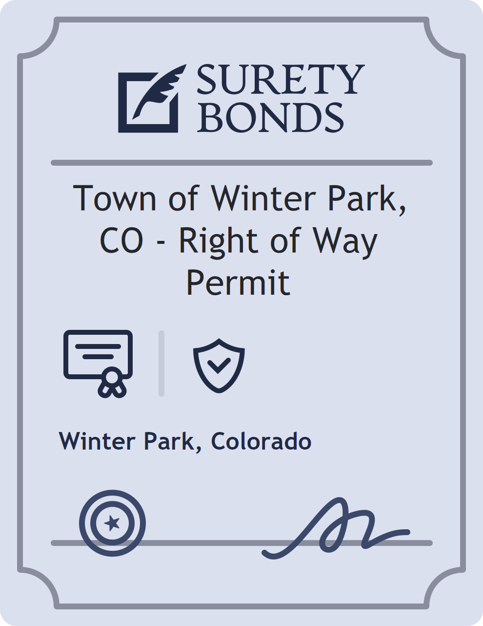 The Town of Winter Park, CO – Right of Way Permit is classified as a Professional License Bonds with a $10,000 obligation in Colorado. Professional License Bonds are surety bonds required for licensed professionals across various industries. They guarantee compliance with licensing laws and ethical standards, protecting clients and regulatory bodies from harm. The surety reviews financial strength, compliance history, and indemnity support before approving the obligation. Maintaining uninterrupted coverage for the entire 1 Year term is essential; lapses can trigger penalties, contract defaults, or license suspension in Colorado. Underwriters typically request financial statements, references, and proof of licensing before quoting terms so they can evaluate repayment capacity. Throughout the bond term, the principal must maintain accurate books, respond to regulator inquiries, and remediate any complaints to prevent a claim. Many authorities in Colorado also require renewal certificates 30 to 60 days in advance, and failure to provide proof can halt permitting or bid submissions. The $10,000 limit demonstrates to customers, partners, and oversight agencies that the bonded party maintains a reliable, surety-backed source of funds dedicated to ongoing compliance. The obligee for this bond is Winter Park.