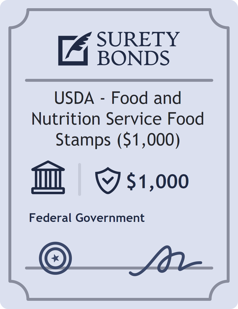 The USDA – Food and Nutrition Service Food Stamps ($1,000) is classified as a Government/Public Official Bonds with a $1,000 obligation in Federal. Government/Public Official Bonds are surety bonds that ensure elected and appointed officials perform their duties faithfully and in accordance with the law. These bonds provide financial protection in cases of misconduct, negligence, or misuse of authority by public officials. The surety reviews financial strength, compliance history, and indemnity support before approving the obligation. Maintaining uninterrupted coverage for the entire 1 Year term is essential; lapses can trigger penalties, contract defaults, or license suspension in Federal. Underwriters typically request financial statements, references, and proof of licensing before quoting terms so they can evaluate repayment capacity. Throughout the bond term, the principal must maintain accurate books, respond to regulator inquiries, and remediate any complaints to prevent a claim. Many authorities in Federal also require renewal certificates 30 to 60 days in advance, and failure to provide proof can halt permitting or bid submissions. The $1,000 limit demonstrates to customers, partners, and oversight agencies that the bonded party maintains a reliable, surety-backed source of funds dedicated to ongoing compliance. The obligee for this bond is USDA.