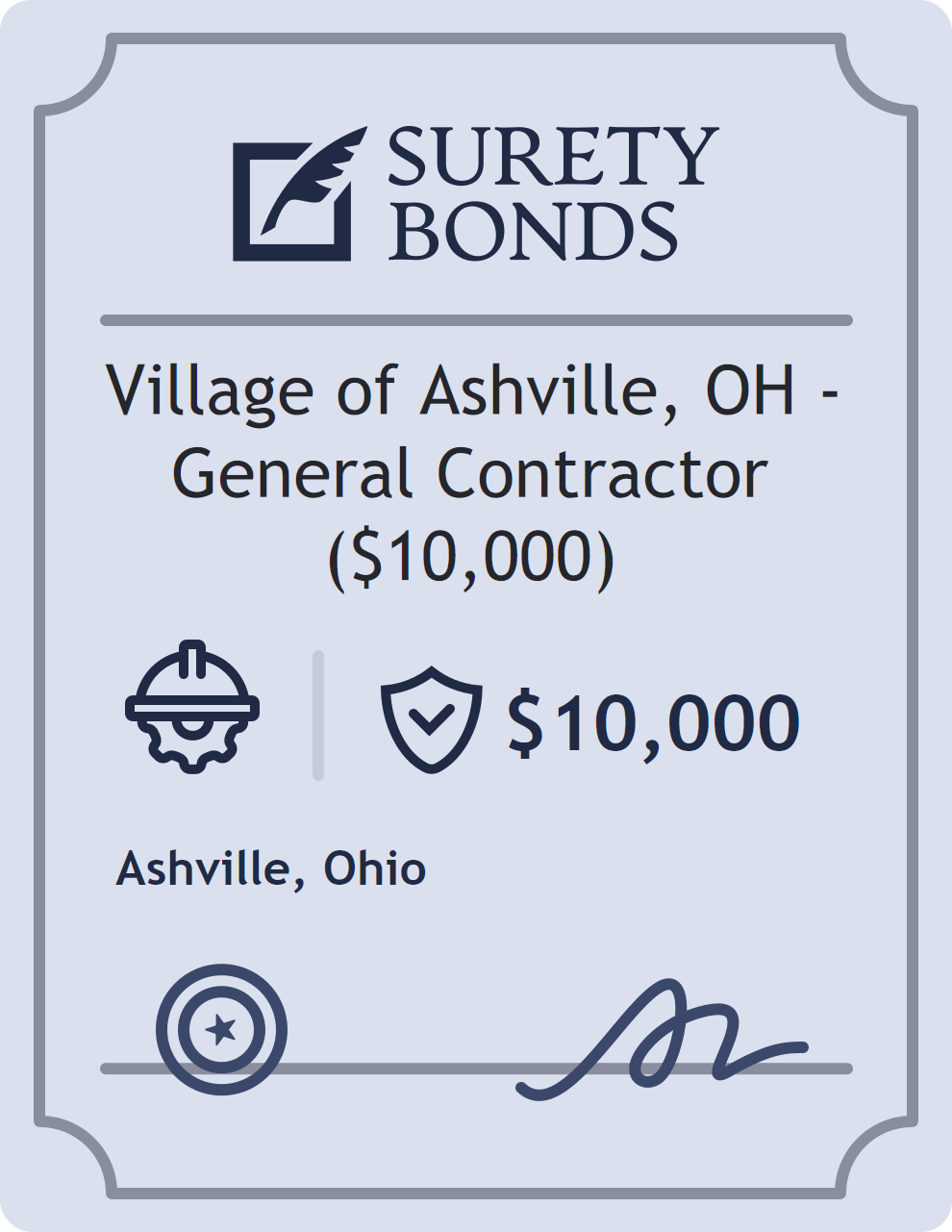The Village of Ashville, OH – General Contractor ($10,000) is classified as a Contractor Bonds with a $10,000 obligation in Ohio. Contractor Bonds are surety bonds required for individuals or businesses performing construction work. They guarantee that contractors will comply with building codes, licensing requirements, and contractual obligations. The bond provides financial protection to property owners and the public in cases of poor workmanship, regulatory violations, or unfinished work. The surety reviews financial strength, compliance history, and indemnity support before approving the obligation. Maintaining uninterrupted coverage for the entire 1 Year term is essential; lapses can trigger penalties, contract defaults, or license suspension in Ohio. Underwriters typically request financial statements, references, and proof of licensing before quoting terms so they can evaluate repayment capacity. Throughout the bond term, the principal must maintain accurate books, respond to regulator inquiries, and remediate any complaints to prevent a claim. Many authorities in Ohio also require renewal certificates 30 to 60 days in advance, and failure to provide proof can halt permitting or bid submissions. The $10,000 limit demonstrates to customers, partners, and oversight agencies that the bonded party maintains a reliable, surety-backed source of funds dedicated to ongoing compliance. The obligee for this bond is Ashville.