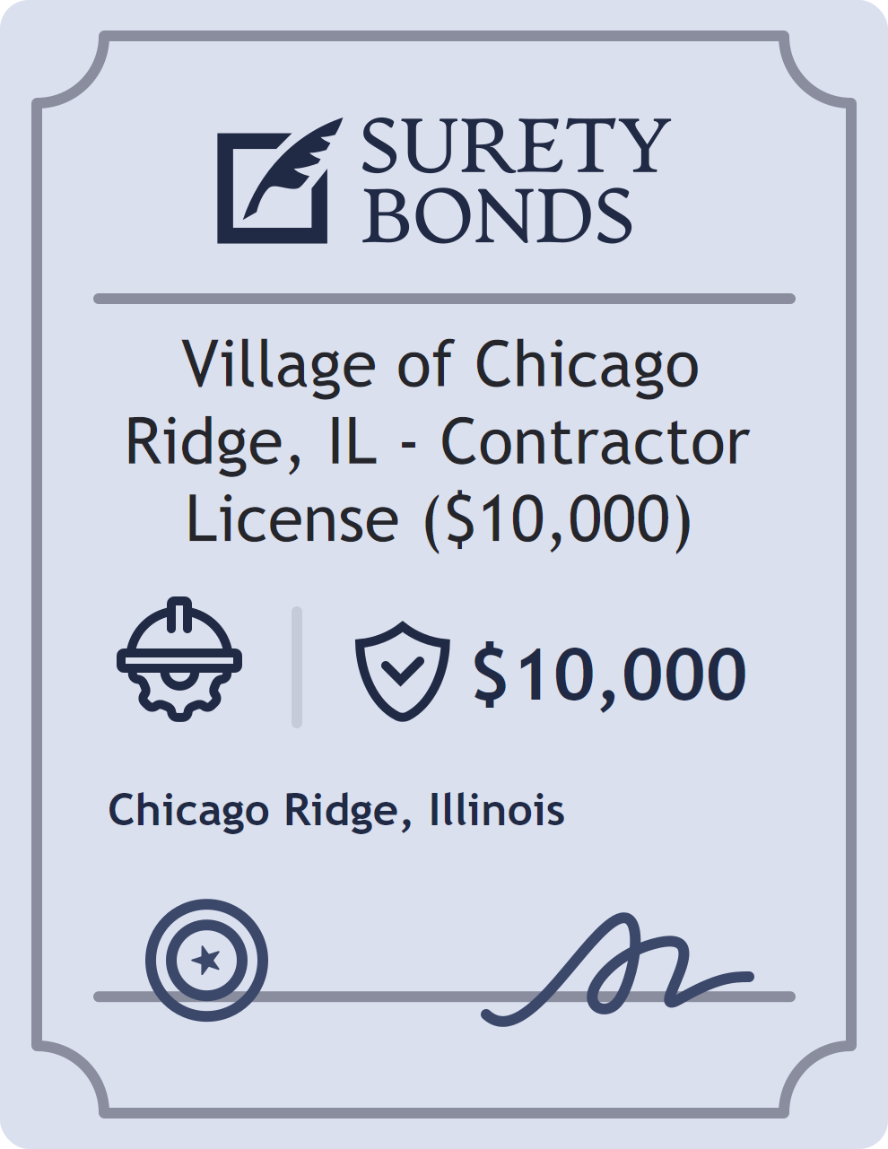 The Village of Chicago Ridge, IL – Contractor License ($10,000) is classified as a Contractor Bonds with a $10,000 obligation in Illinois. Contractor Bonds are surety bonds required for individuals or businesses performing construction work. They guarantee that contractors will comply with building codes, licensing requirements, and contractual obligations. The bond provides financial protection to property owners and the public in cases of poor workmanship, regulatory violations, or unfinished work. The surety reviews financial strength, compliance history, and indemnity support before approving the obligation. Maintaining uninterrupted coverage for the entire 1 Year term is essential; lapses can trigger penalties, contract defaults, or license suspension in Illinois. Underwriters typically request financial statements, references, and proof of licensing before quoting terms so they can evaluate repayment capacity. Throughout the bond term, the principal must maintain accurate books, respond to regulator inquiries, and remediate any complaints to prevent a claim. Many authorities in Illinois also require renewal certificates 30 to 60 days in advance, and failure to provide proof can halt permitting or bid submissions. The $10,000 limit demonstrates to customers, partners, and oversight agencies that the bonded party maintains a reliable, surety-backed source of funds dedicated to ongoing compliance. The obligee for this bond is Chicago Ridge.