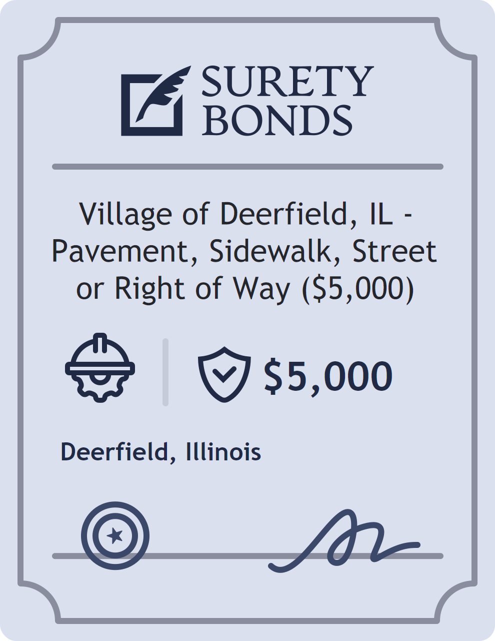The Village of Deerfield, IL – Pavement, Sidewalk, Street or Right of Way ($5,000) is classified as a Contractor Bonds with a $5,000 obligation in Illinois. Contractor Bonds are surety bonds required for individuals or businesses performing construction work. They guarantee that contractors will comply with building codes, licensing requirements, and contractual obligations. The bond provides financial protection to property owners and the public in cases of poor workmanship, regulatory violations, or unfinished work. The surety reviews financial strength, compliance history, and indemnity support before approving the obligation. Maintaining uninterrupted coverage for the entire 1 Year term is essential; lapses can trigger penalties, contract defaults, or license suspension in Illinois. Underwriters typically request financial statements, references, and proof of licensing before quoting terms so they can evaluate repayment capacity. Throughout the bond term, the principal must maintain accurate books, respond to regulator inquiries, and remediate any complaints to prevent a claim. Many authorities in Illinois also require renewal certificates 30 to 60 days in advance, and failure to provide proof can halt permitting or bid submissions. The $5,000 limit demonstrates to customers, partners, and oversight agencies that the bonded party maintains a reliable, surety-backed source of funds dedicated to ongoing compliance. The obligee for this bond is Deerfield.