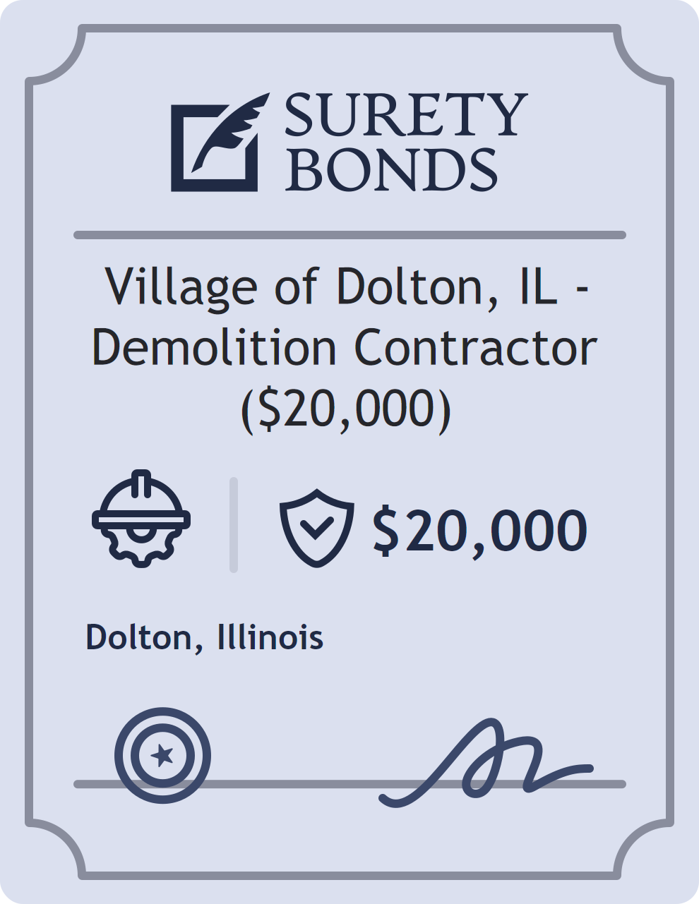 The Village of Dolton, IL – Demolition Contractor ($20,000) is classified as a Contractor Bonds with a $20,000 obligation in Illinois. Contractor Bonds are surety bonds required for individuals or businesses performing construction work. They guarantee that contractors will comply with building codes, licensing requirements, and contractual obligations. The bond provides financial protection to property owners and the public in cases of poor workmanship, regulatory violations, or unfinished work. The surety reviews financial strength, compliance history, and indemnity support before approving the obligation. Maintaining uninterrupted coverage for the entire 1 Year term is essential; lapses can trigger penalties, contract defaults, or license suspension in Illinois. Underwriters typically request financial statements, references, and proof of licensing before quoting terms so they can evaluate repayment capacity. Throughout the bond term, the principal must maintain accurate books, respond to regulator inquiries, and remediate any complaints to prevent a claim. Many authorities in Illinois also require renewal certificates 30 to 60 days in advance, and failure to provide proof can halt permitting or bid submissions. The $20,000 limit demonstrates to customers, partners, and oversight agencies that the bonded party maintains a reliable, surety-backed source of funds dedicated to ongoing compliance. The obligee for this bond is Dolton.