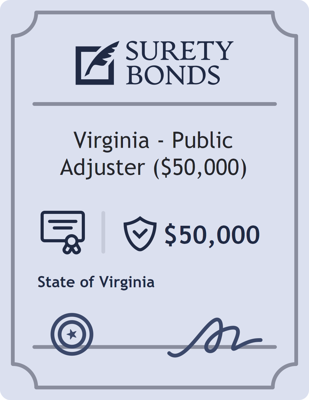 The Virginia – Public Adjuster ($50,000) is classified as a Professional License Bonds with a $50,000 obligation in Virginia. Professional License Bonds are surety bonds required for licensed professionals across various industries. They guarantee compliance with licensing laws and ethical standards, protecting clients and regulatory bodies from harm. The surety reviews financial strength, compliance history, and indemnity support before approving the obligation. Maintaining uninterrupted coverage for the entire 1 Year term is essential; lapses can trigger penalties, contract defaults, or license suspension in Virginia. Underwriters typically request financial statements, references, and proof of licensing before quoting terms so they can evaluate repayment capacity. Throughout the bond term, the principal must maintain accurate books, respond to regulator inquiries, and remediate any complaints to prevent a claim. Many authorities in Virginia also require renewal certificates 30 to 60 days in advance, and failure to provide proof can halt permitting or bid submissions. The $50,000 limit demonstrates to customers, partners, and oversight agencies that the bonded party maintains a reliable, surety-backed source of funds dedicated to ongoing compliance. The obligee for this bond is State of Virginia.