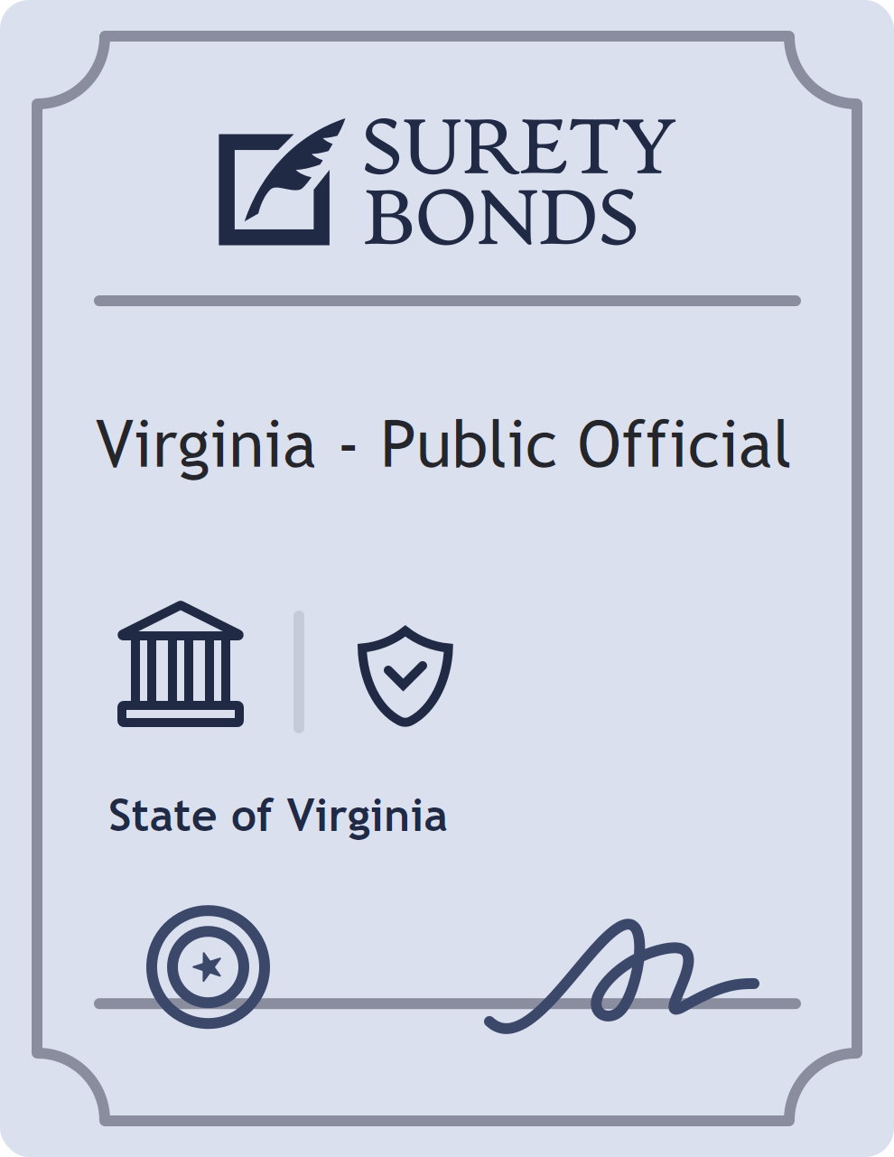 The Virginia – Public Official is classified as a Government/Public Official Bonds with a $10,000 obligation in Virginia. Government/Public Official Bonds are surety bonds that ensure elected and appointed officials perform their duties faithfully and in accordance with the law. These bonds provide financial protection in cases of misconduct, negligence, or misuse of authority by public officials. The surety reviews financial strength, compliance history, and indemnity support before approving the obligation. Maintaining uninterrupted coverage for the entire 1 Year term is essential; lapses can trigger penalties, contract defaults, or license suspension in Virginia. Underwriters typically request financial statements, references, and proof of licensing before quoting terms so they can evaluate repayment capacity. Throughout the bond term, the principal must maintain accurate books, respond to regulator inquiries, and remediate any complaints to prevent a claim. Many authorities in Virginia also require renewal certificates 30 to 60 days in advance, and failure to provide proof can halt permitting or bid submissions. The $10,000 limit demonstrates to customers, partners, and oversight agencies that the bonded party maintains a reliable, surety-backed source of funds dedicated to ongoing compliance. The obligee for this bond is State of Virginia.