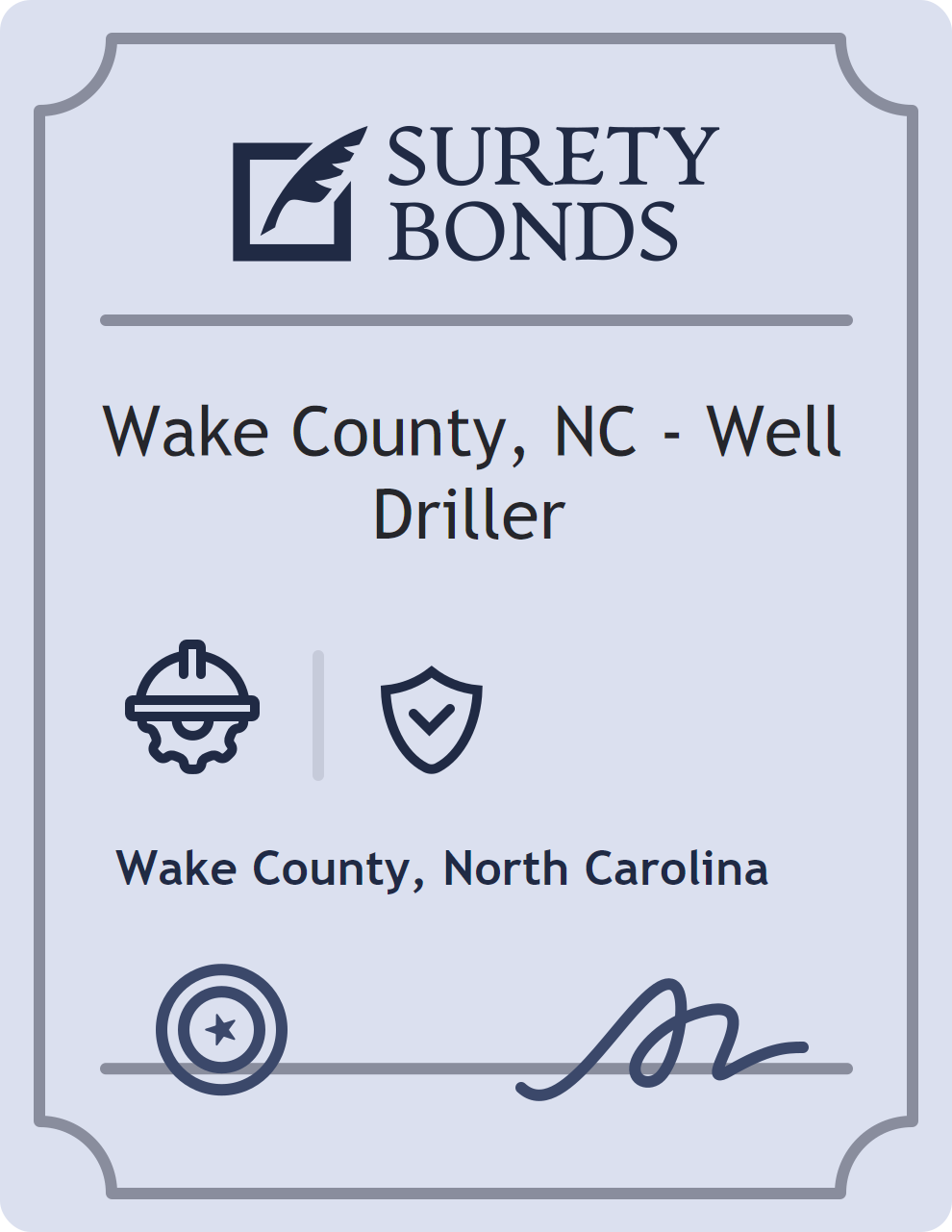 The Wake County, NC – Well Driller is classified as a Contractor Bonds with a $10,000 obligation in North Carolina. Contractor Bonds are surety bonds required for individuals or businesses performing construction work. They guarantee that contractors will comply with building codes, licensing requirements, and contractual obligations. The bond provides financial protection to property owners and the public in cases of poor workmanship, regulatory violations, or unfinished work. The surety reviews financial strength, compliance history, and indemnity support before approving the obligation. Maintaining uninterrupted coverage for the entire 1 Year term is essential; lapses can trigger penalties, contract defaults, or license suspension in North Carolina. Underwriters typically request financial statements, references, and proof of licensing before quoting terms so they can evaluate repayment capacity. Throughout the bond term, the principal must maintain accurate books, respond to regulator inquiries, and remediate any complaints to prevent a claim. Many authorities in North Carolina also require renewal certificates 30 to 60 days in advance, and failure to provide proof can halt permitting or bid submissions. The $10,000 limit demonstrates to customers, partners, and oversight agencies that the bonded party maintains a reliable, surety-backed source of funds dedicated to ongoing compliance. The obligee for this bond is Wake County.