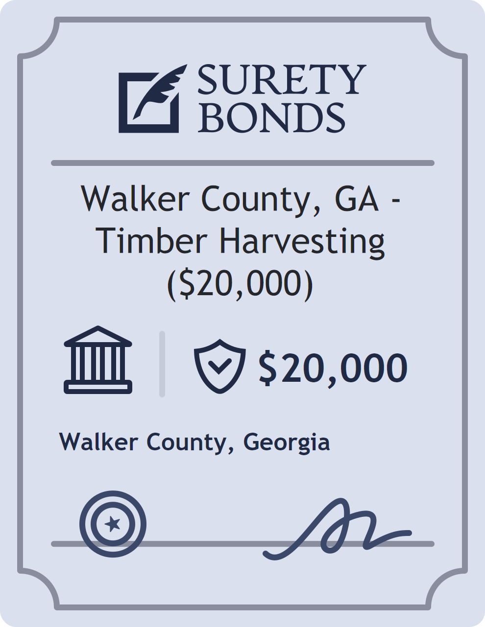 The Walker County, GA – Timber Harvesting ($20,000) is classified as a Government/Public Official Bonds with a $20,000 obligation in Georgia. Government/Public Official Bonds are surety bonds that ensure elected and appointed officials perform their duties faithfully and in accordance with the law. These bonds provide financial protection in cases of misconduct, negligence, or misuse of authority by public officials. The surety reviews financial strength, compliance history, and indemnity support before approving the obligation. Maintaining uninterrupted coverage for the entire 1 Year term is essential; lapses can trigger penalties, contract defaults, or license suspension in Georgia. Underwriters typically request financial statements, references, and proof of licensing before quoting terms so they can evaluate repayment capacity. Throughout the bond term, the principal must maintain accurate books, respond to regulator inquiries, and remediate any complaints to prevent a claim. Many authorities in Georgia also require renewal certificates 30 to 60 days in advance, and failure to provide proof can halt permitting or bid submissions. The $20,000 limit demonstrates to customers, partners, and oversight agencies that the bonded party maintains a reliable, surety-backed source of funds dedicated to ongoing compliance. The obligee for this bond is Walker County.