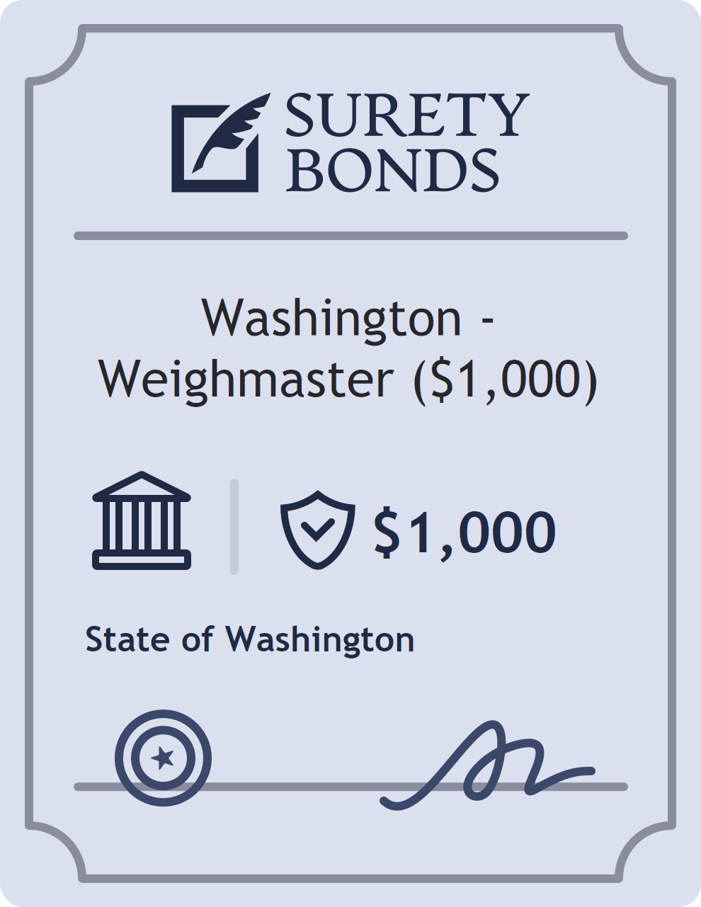 The Washington – Weighmaster ($1,000) is classified as a Government/Public Official Bonds with a $1,000 obligation in Washington. Government/Public Official Bonds are surety bonds that ensure elected and appointed officials perform their duties faithfully and in accordance with the law. These bonds provide financial protection in cases of misconduct, negligence, or misuse of authority by public officials. The surety reviews financial strength, compliance history, and indemnity support before approving the obligation. Maintaining uninterrupted coverage for the entire 1 Year term is essential; lapses can trigger penalties, contract defaults, or license suspension in Washington. Underwriters typically request financial statements, references, and proof of licensing before quoting terms so they can evaluate repayment capacity. Throughout the bond term, the principal must maintain accurate books, respond to regulator inquiries, and remediate any complaints to prevent a claim. Many authorities in Washington also require renewal certificates 30 to 60 days in advance, and failure to provide proof can halt permitting or bid submissions. The $1,000 limit demonstrates to customers, partners, and oversight agencies that the bonded party maintains a reliable, surety-backed source of funds dedicated to ongoing compliance.