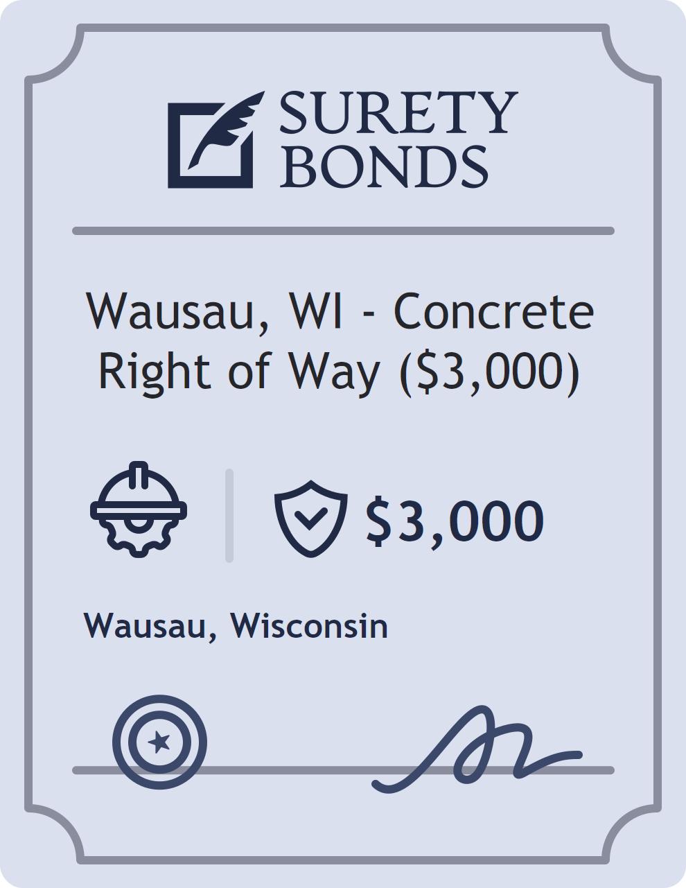 The Wausau, WI – Concrete Right of Way ($3,000) is classified as a Contractor Bonds with a $3,000 obligation in Wisconsin. Contractor Bonds are surety bonds required for individuals or businesses performing construction work. They guarantee that contractors will comply with building codes, licensing requirements, and contractual obligations. The bond provides financial protection to property owners and the public in cases of poor workmanship, regulatory violations, or unfinished work. The surety reviews financial strength, compliance history, and indemnity support before approving the obligation. Maintaining uninterrupted coverage for the entire 1 Year term is essential; lapses can trigger penalties, contract defaults, or license suspension in Wisconsin. Underwriters typically request financial statements, references, and proof of licensing before quoting terms so they can evaluate repayment capacity. Throughout the bond term, the principal must maintain accurate books, respond to regulator inquiries, and remediate any complaints to prevent a claim. Many authorities in Wisconsin also require renewal certificates 30 to 60 days in advance, and failure to provide proof can halt permitting or bid submissions. The $3,000 limit demonstrates to customers, partners, and oversight agencies that the bonded party maintains a reliable, surety-backed source of funds dedicated to ongoing compliance.